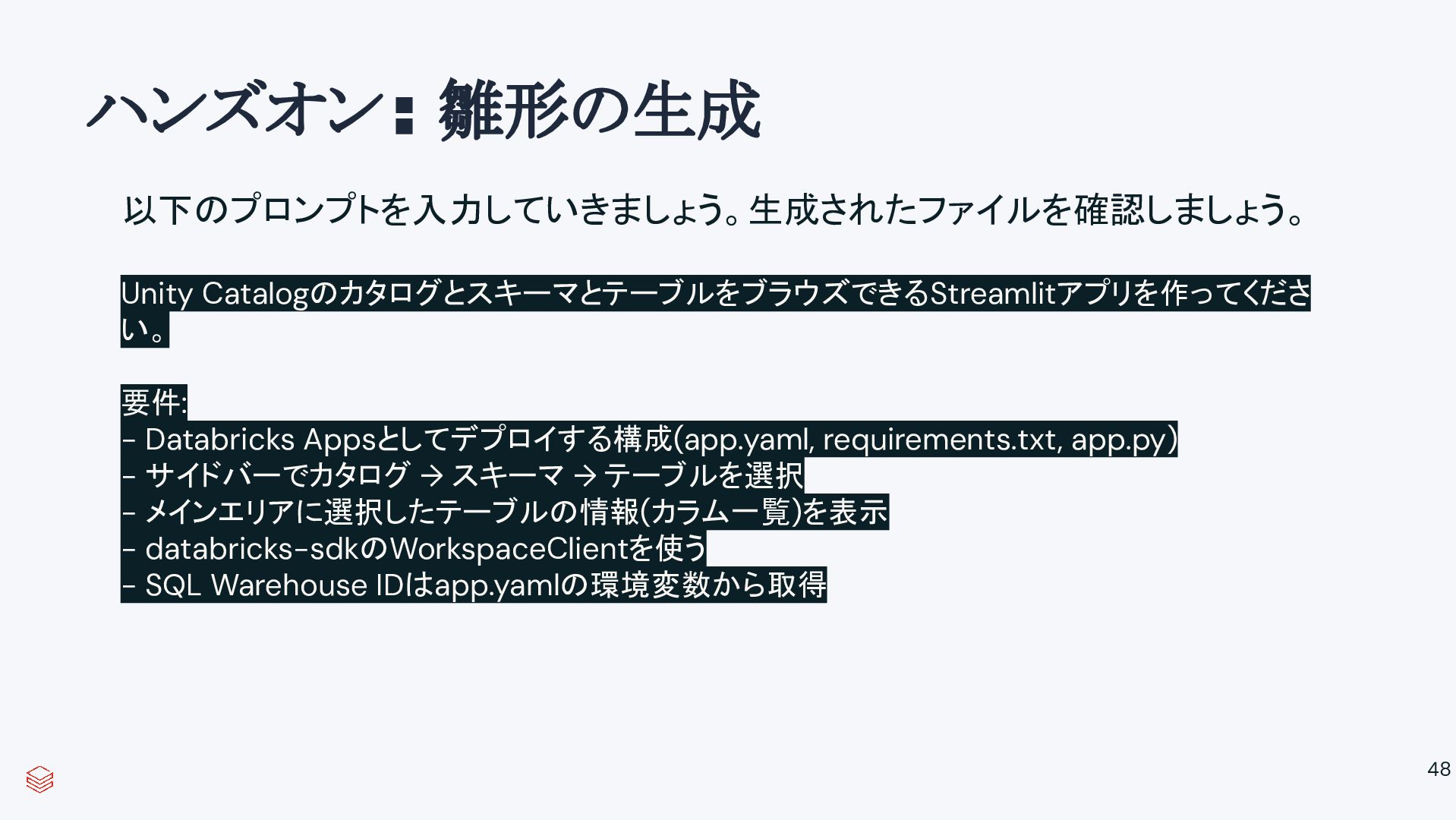ハンズオン : 雛形の生成 48 以下のプロンプトを入力していきましょう。生成されたファイルを確認しましょう。 Unity CatalogのカタログとスキーマとテーブルをブラウズできるStreamlitアプリを作ってくださ い。 要件: -