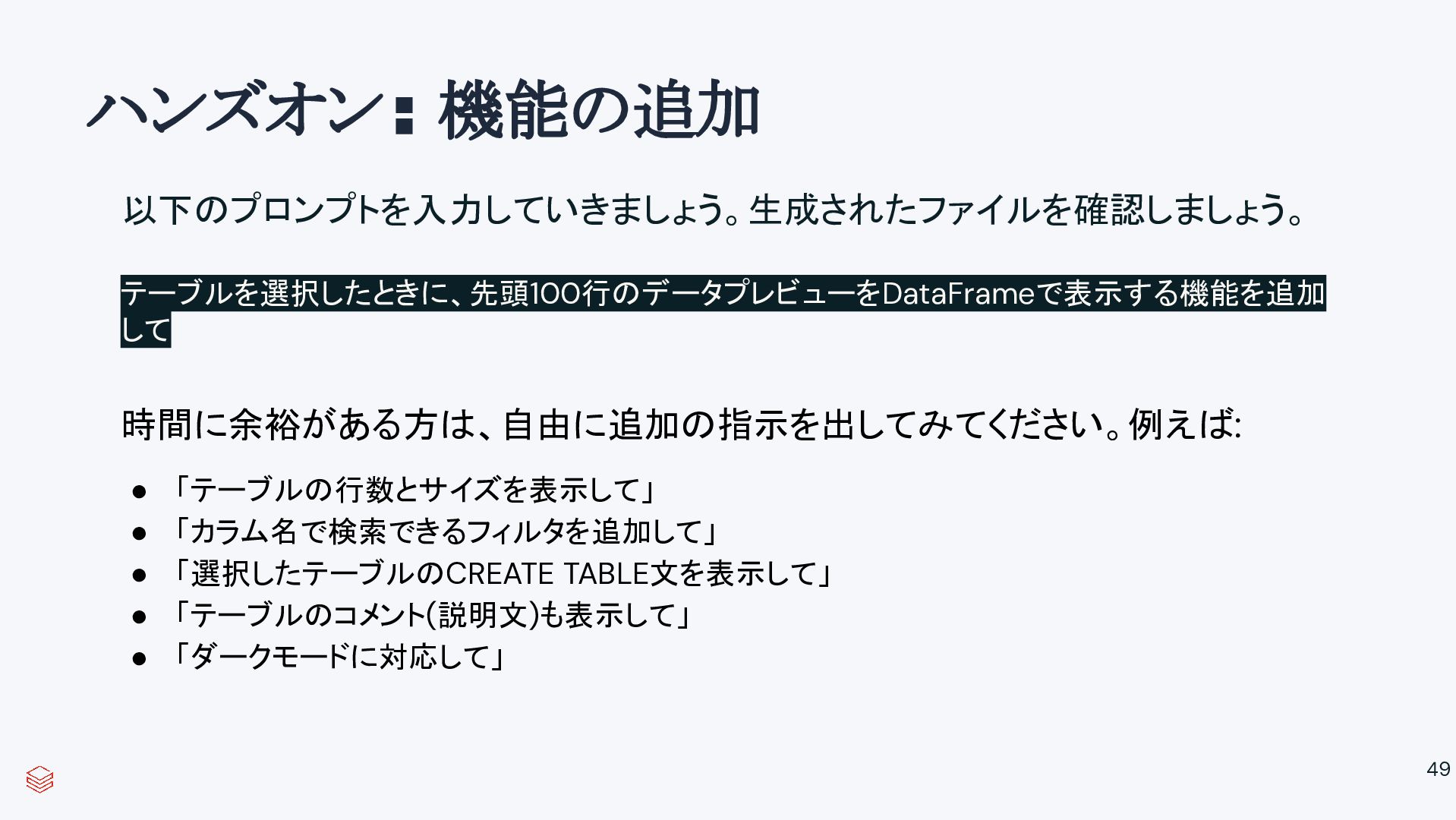 ハンズオン : 機能の追加 49 以下のプロンプトを入力していきましょう。生成されたファイルを確認しましょう。 テーブルを選択したときに、先頭100行のデータプレビューをDataFrameで表示する機能を追加 して 時間に余裕がある方は、自由に追加の指示を出してみてください。例えば: • 「テーブルの行数とサイズを表示して」