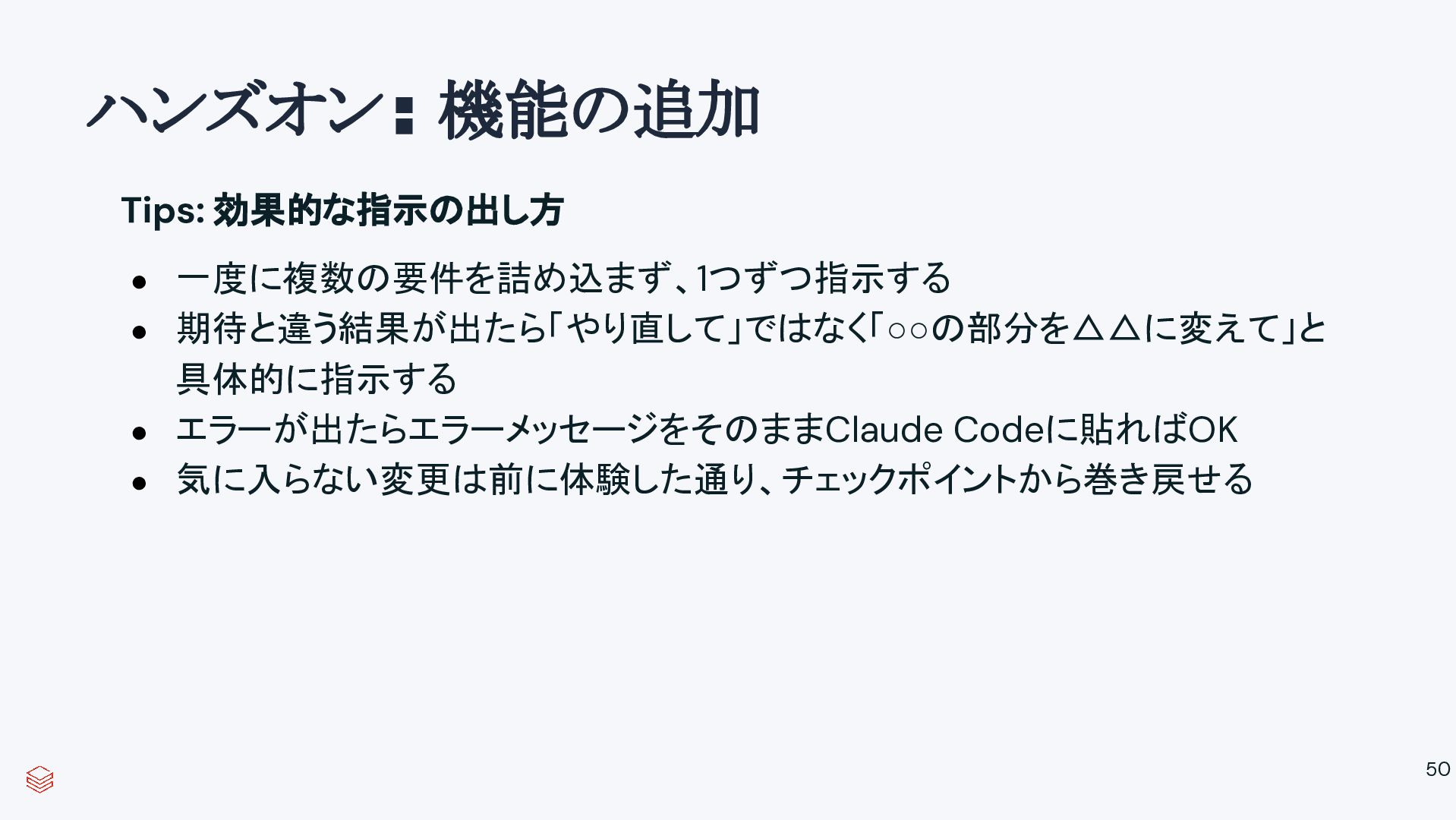 ハンズオン : 機能の追加 50 Tips: 効果的な指示の出し方 • 一度に複数の要件を詰め込まず、1つずつ指示する • 期待と違う結果が出たら「やり直して」ではなく「◦◦の部分を△△に変えて」と