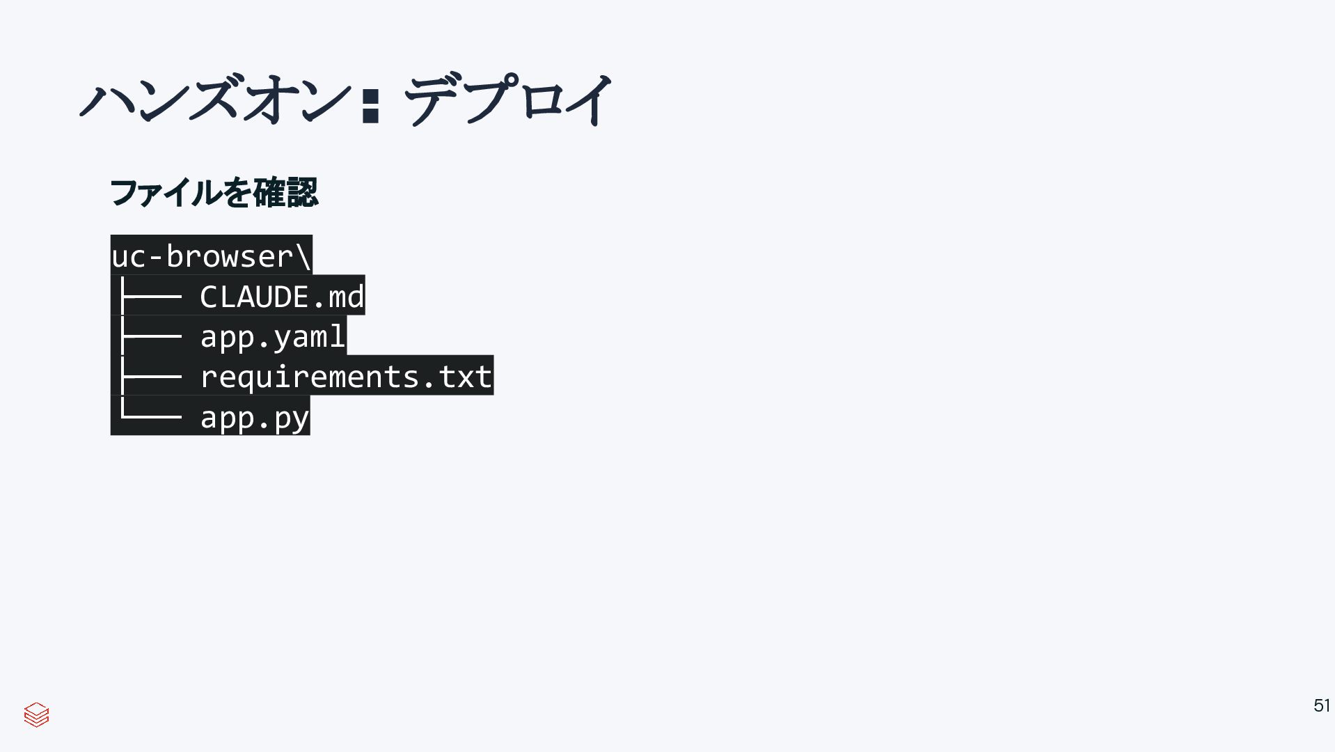 ハンズオン : デプロイ 51 ファイルを確認 uc-browser\ ├── CLAUDE.md ├── app.yaml