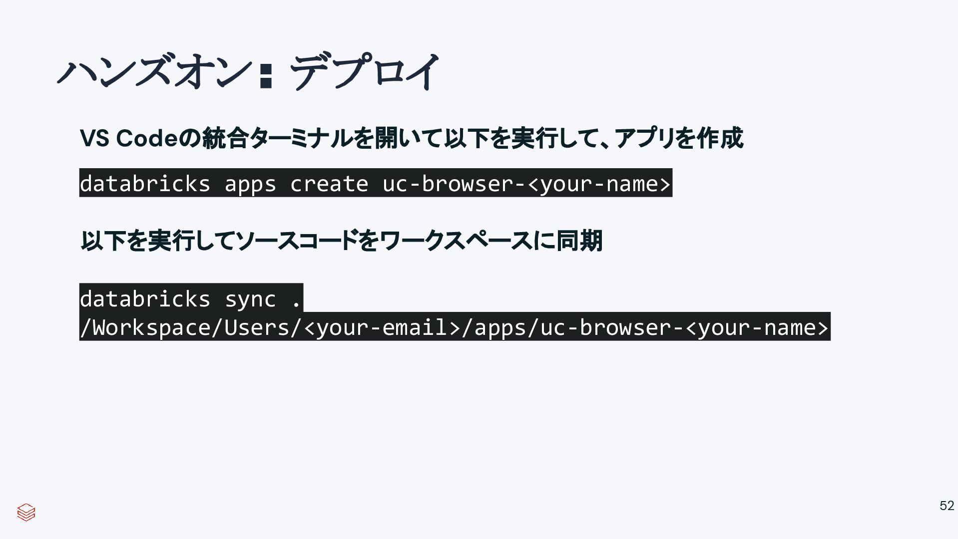 ハンズオン : デプロイ 52 VS Codeの統合ターミナルを開いて以下を実行して、アプリを作成 databricks apps create uc-browser-<your-name>