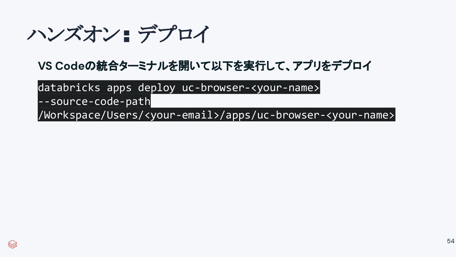 ハンズオン : デプロイ 54 VS Codeの統合ターミナルを開いて以下を実行して、アプリをデプロイ databricks apps deploy uc-browser-<your-name>