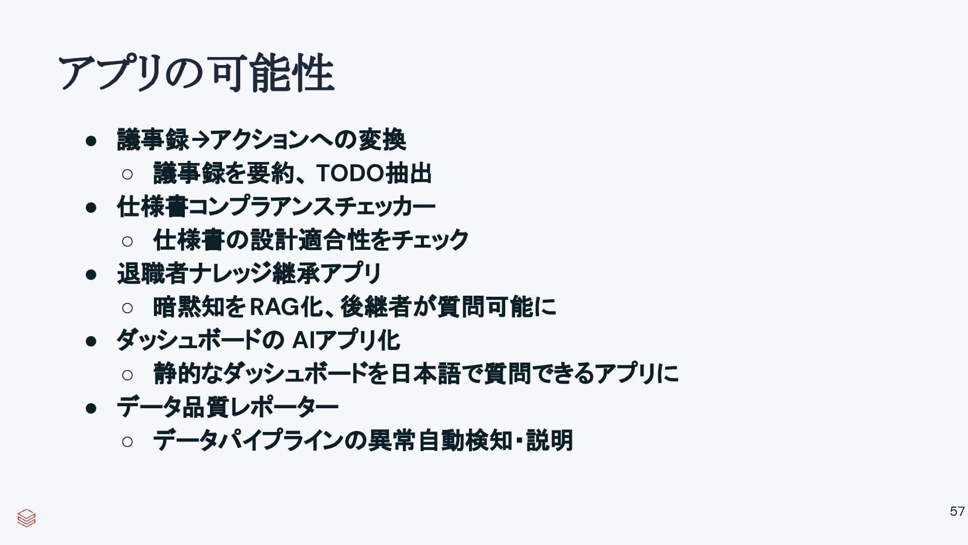 仕様書の設計適合性をチェック • 退職者ナレッジ継承アプリ ◦ 暗黙知をRAG化、後継者が質問可能に • ダッシュボードの AIアプリ化 ◦ 静的なダッシュボードを日本語で質問できるアプリに • データ品質レポーター ◦ データパイプラインの異常自動検知・説明