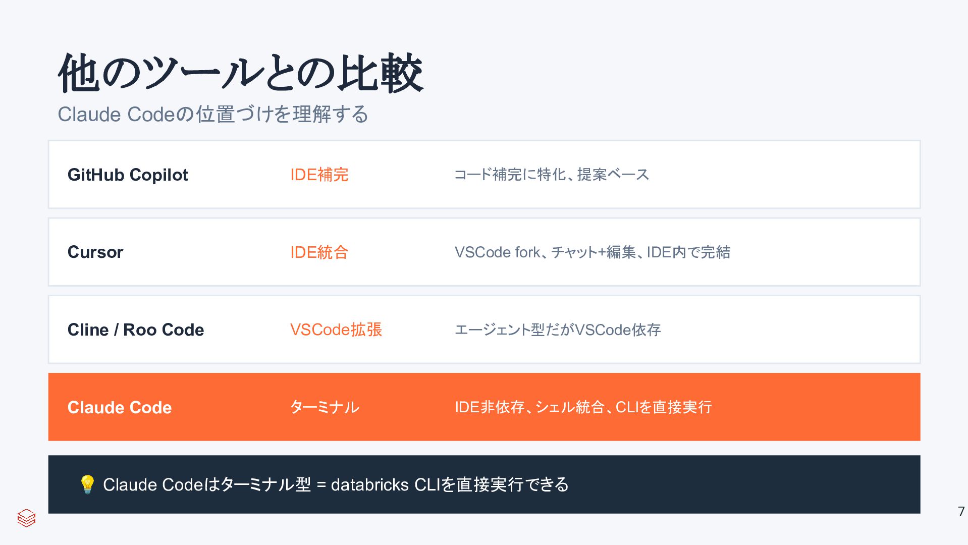 できること • ファイルの作成・編集・削除 • シェルコマンドの実行 • エラー解析と自動修正 $ claude > Databricks Appsで動くSQLクエリ実行アプリを作って # Claude Codeが自律的に: # ファイル構成を考え → コード生成 → 設定ファイル作成 → デプロイまで 6