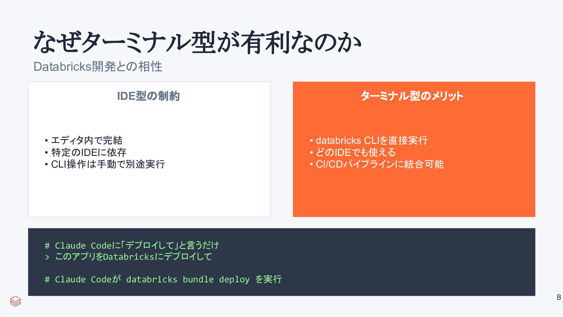 なぜターミナル型が有利なのか Databricks開発との相性 IDE型の制約 • エディタ内で完結 • 特定のIDEに依存 • CLI操作は手動で別途実行 ターミナル型のメリット