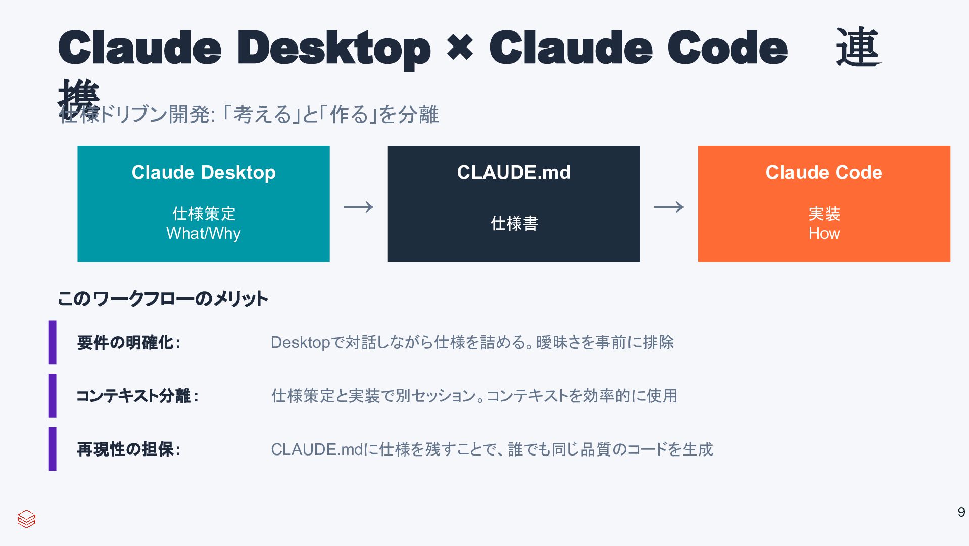 Desktop 仕様策定 What/Why → CLAUDE.md 仕様書 → Claude Code 実装 How このワークフローのメリット 要件の明確化: Desktopで対話しながら仕様を詰める。曖昧さを事前に排除 コンテキスト分離: 仕様策定と実装で別セッション。コンテキストを効率的に使用 再現性の担保: CLAUDE.mdに仕様を残すことで、誰でも同じ品質のコードを生成 9