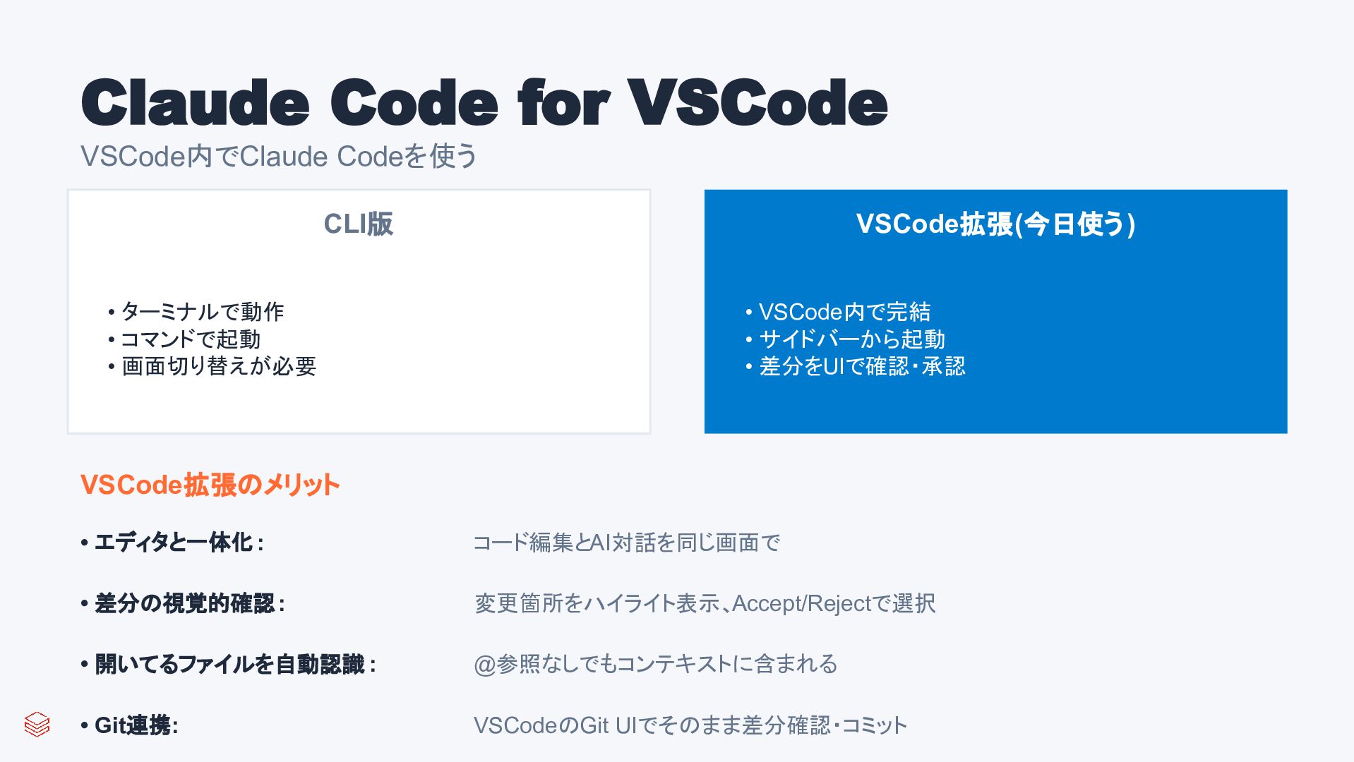 コマンドで起動 • 画面切り替えが必要 VSCode拡張(今日使う) • VSCode内で完結 • サイドバーから起動 • 差分をUIで確認・承認 VSCode拡張のメリット • エディタと一体化: コード編集とAI対話を同じ画面で • 差分の視覚的確認: 変更箇所をハイライト表示、Accept/Rejectで選択 • 開いてるファイルを自動認識 : @参照なしでもコンテキストに含まれる • Git連携: VSCodeのGit UIでそのまま差分確認・コミット
