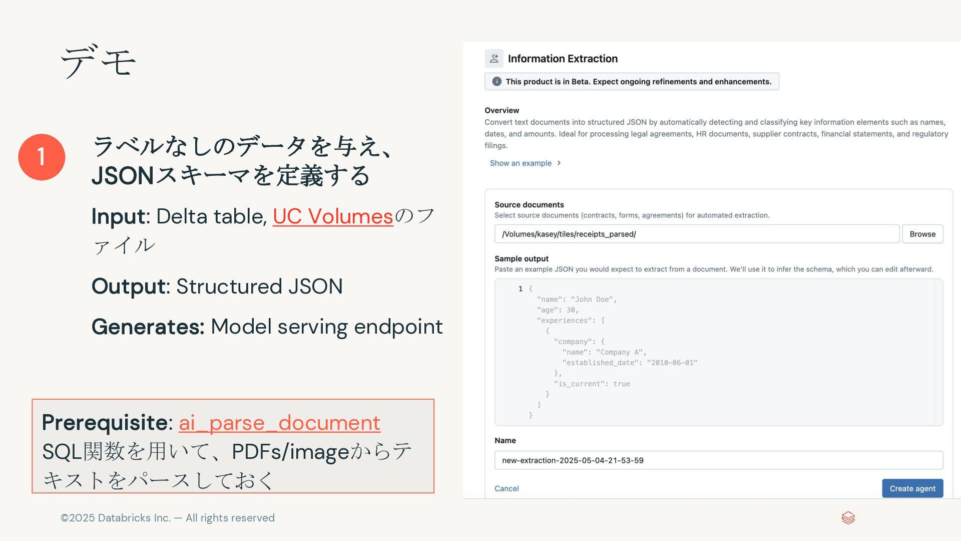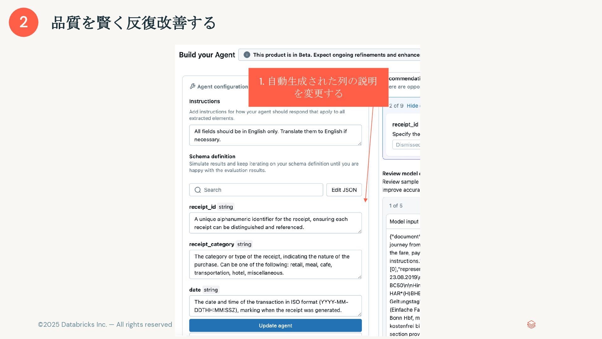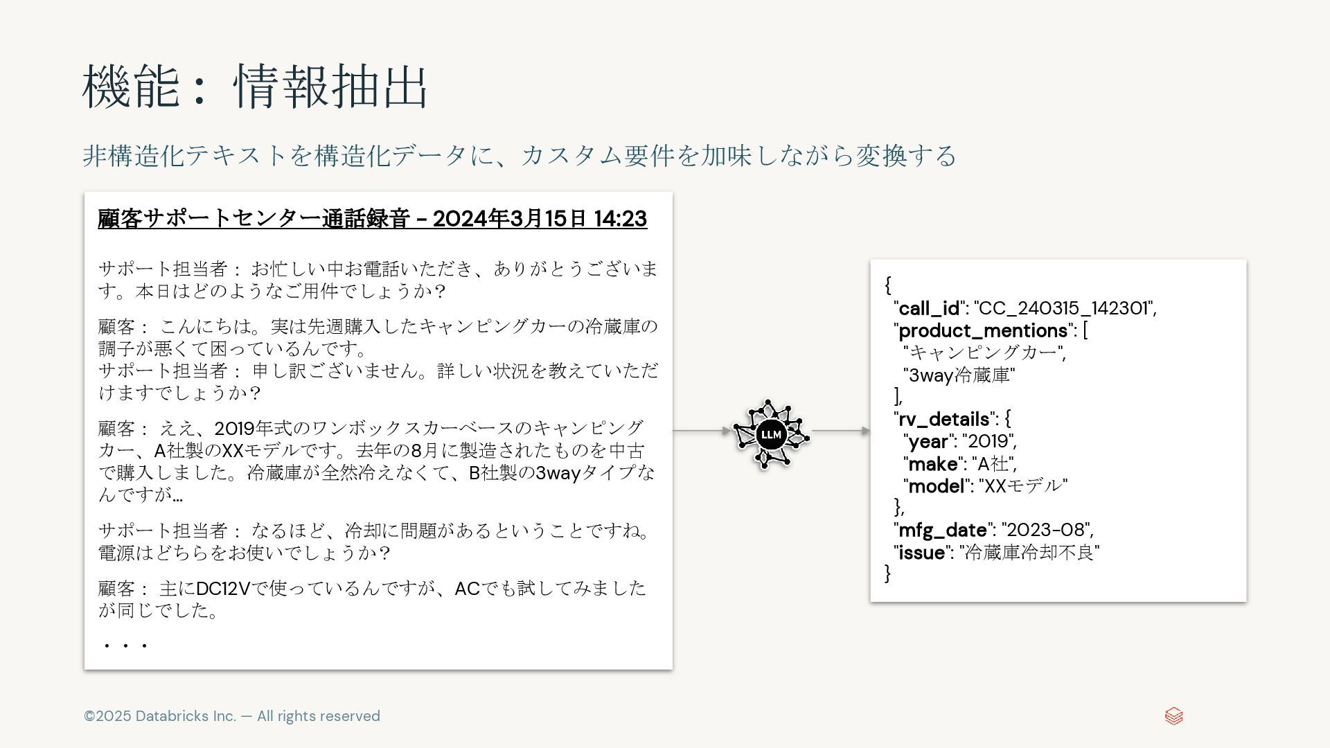 非構造化テキストを構造化データに、カスタム要件を加味しながら変換する 顧客サポートセンター通話録音 - 2024年3月15日 14:23 サポート担当者: お忙しい中お電話いただき、ありがとうございま す。本日はどのようなご用件でしょうか? 顧客: こんにちは。実は先週購入したキャンピングカーの冷蔵庫の 調子が悪くて困っているんです。 サポート担当者: 申し訳ございません。詳しい状況を教えていただ けますでしょうか? 顧客: ええ、2019年式のワンボックスカーベースのキャンピング カー、A社製のXXモデルです。去年の8月に製造されたものを中古 で購入しました。冷蔵庫が全然冷えなくて、B社製の3wayタイプな んですが... サポート担当者: なるほど、冷却に問題があるということですね。 電源はどちらをお使いでしょうか? 顧客: 主にDC12Vで使っているんですが、ACでも試してみました が同じでした。 ・・・ { "call_id": "CC_240315_142301", "product_mentions": [ "キャンピングカー", "3way冷蔵庫" ], "rv_details": { "year": "2019", "make": "A社", "model": "XXモデル" }, "mfg_date": "2023-08", "issue": "冷蔵庫冷却不良" }