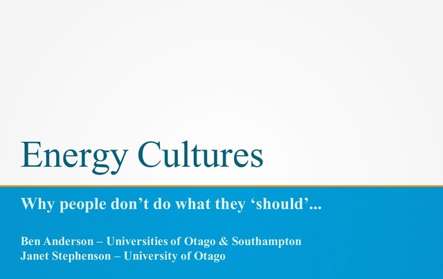 R., Stephenson, J. (June 2011) Rationalising energy- related behavior in the home: Insights from a value-laddering approach. European Council for an Energy Efficient Economy Summer Study, France, pp.2109-2119 Single bar heater Single glazing Poor insulation Low income A ‘luxury’ to heat the kitchen Low expectations of warmth Maintaining traditions from upbringing Uses heater sparingly Puts on more clothes when cold Doesn’t heat bedroom Draws curtains & closes doors Internally consistent and habituated energy culture