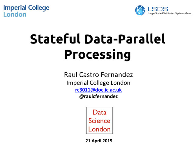 dataflow frameworks SDG: Stateful Dataflow Graphs – Abstrac@ons for distributed mutable state – AnnotaNons to disambiguate types of distributed state and state access – Checkpoint-‐based fault tolerance mechanism 52 Summary Thank you! Any QuesNons? @raulcfernandez [email protected] h)ps://github.com/raulcf/SEEPng/