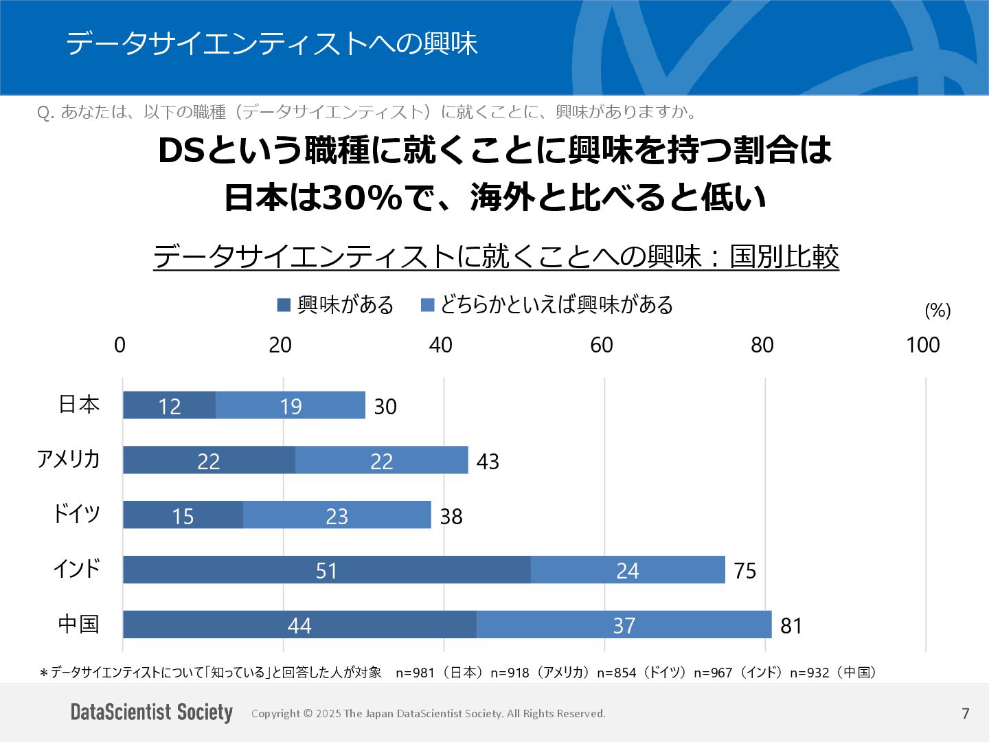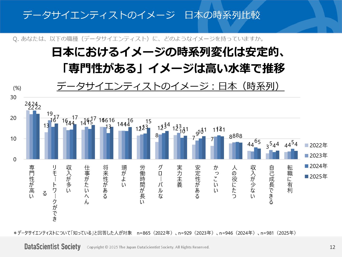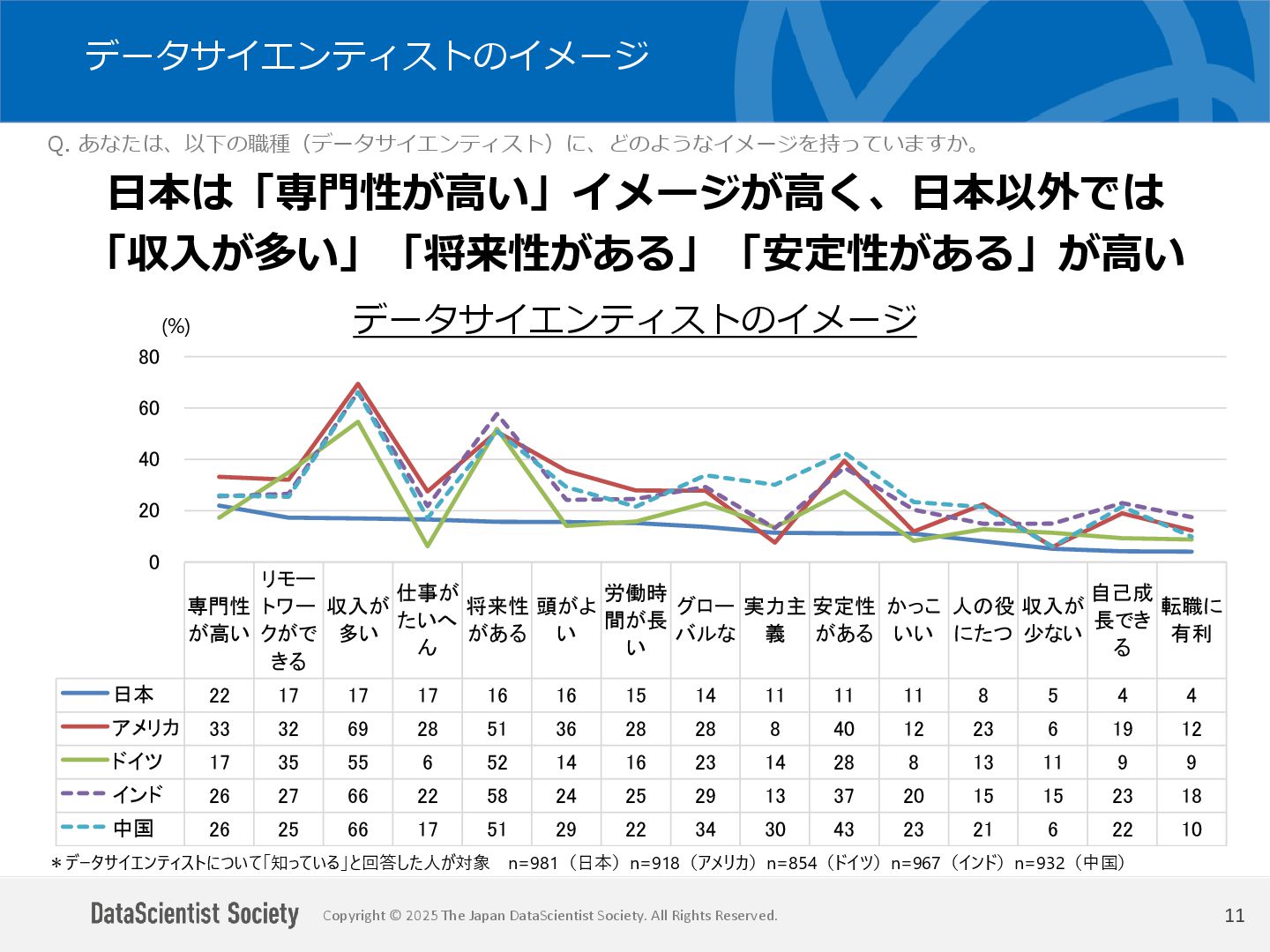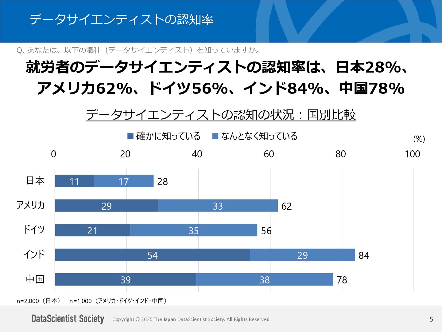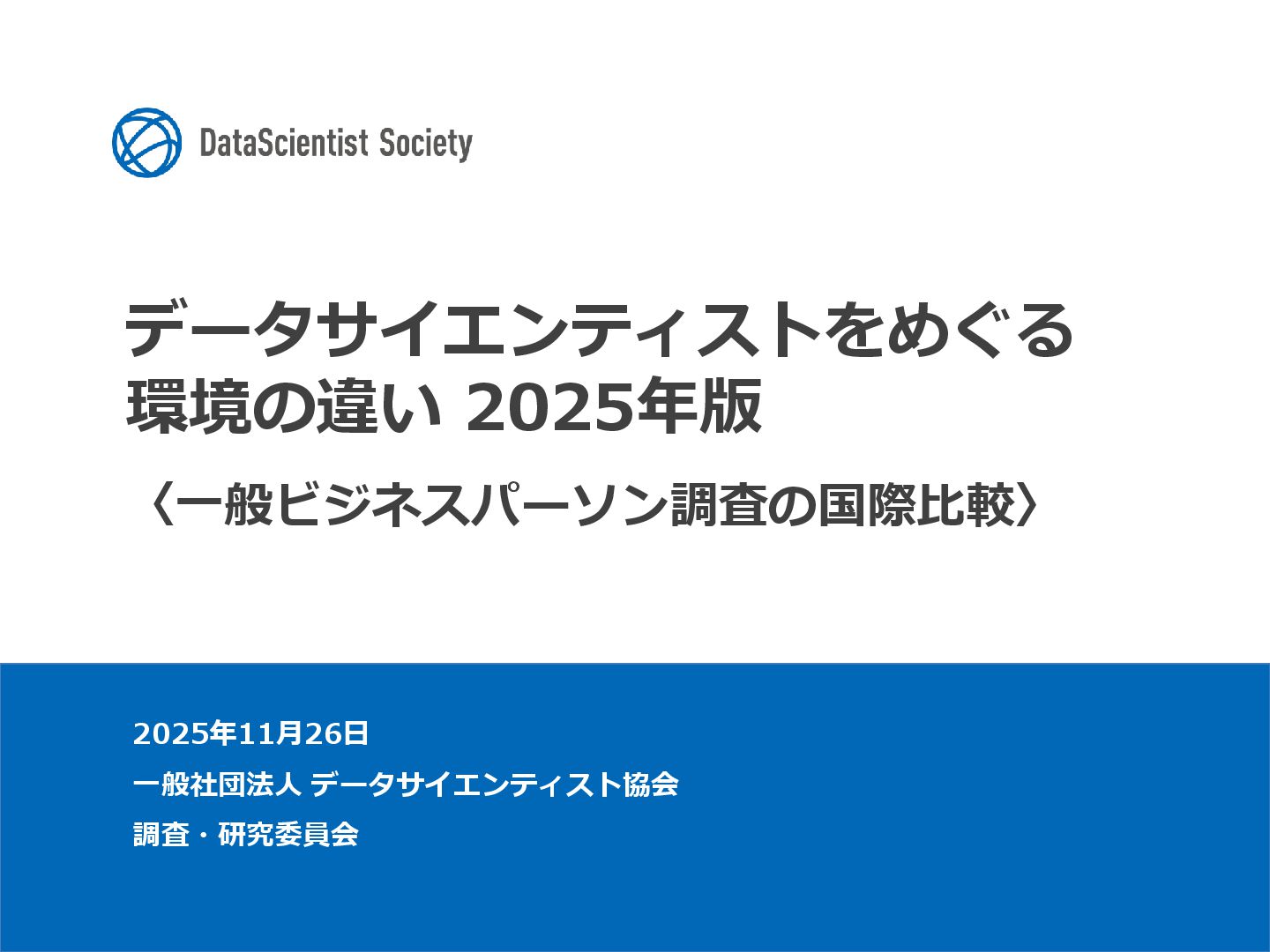 データサイエンティスト協会 調査・研究委員会(委員長:塩谷 周久)は、データサイエンス人材の需給バランス改善を目的に、認知・意識・活用実態を毎年調査しています。2025年は中国を加えた5カ国を対象に、データサイエンティストの社会的認知と生成AIの実務利用を国際比較しました。