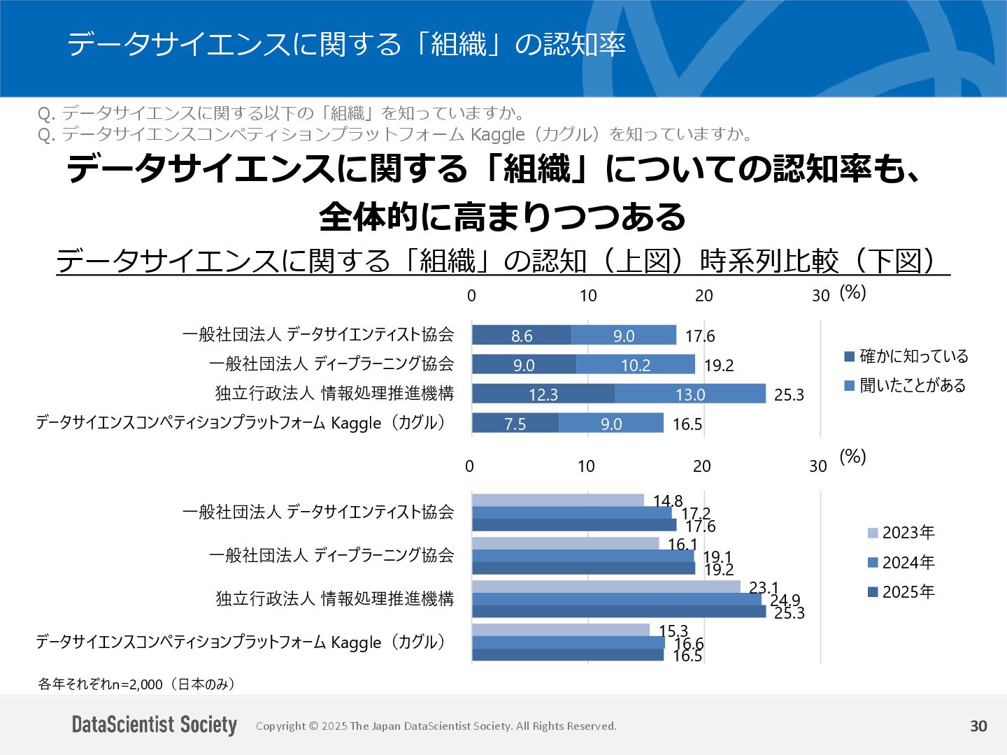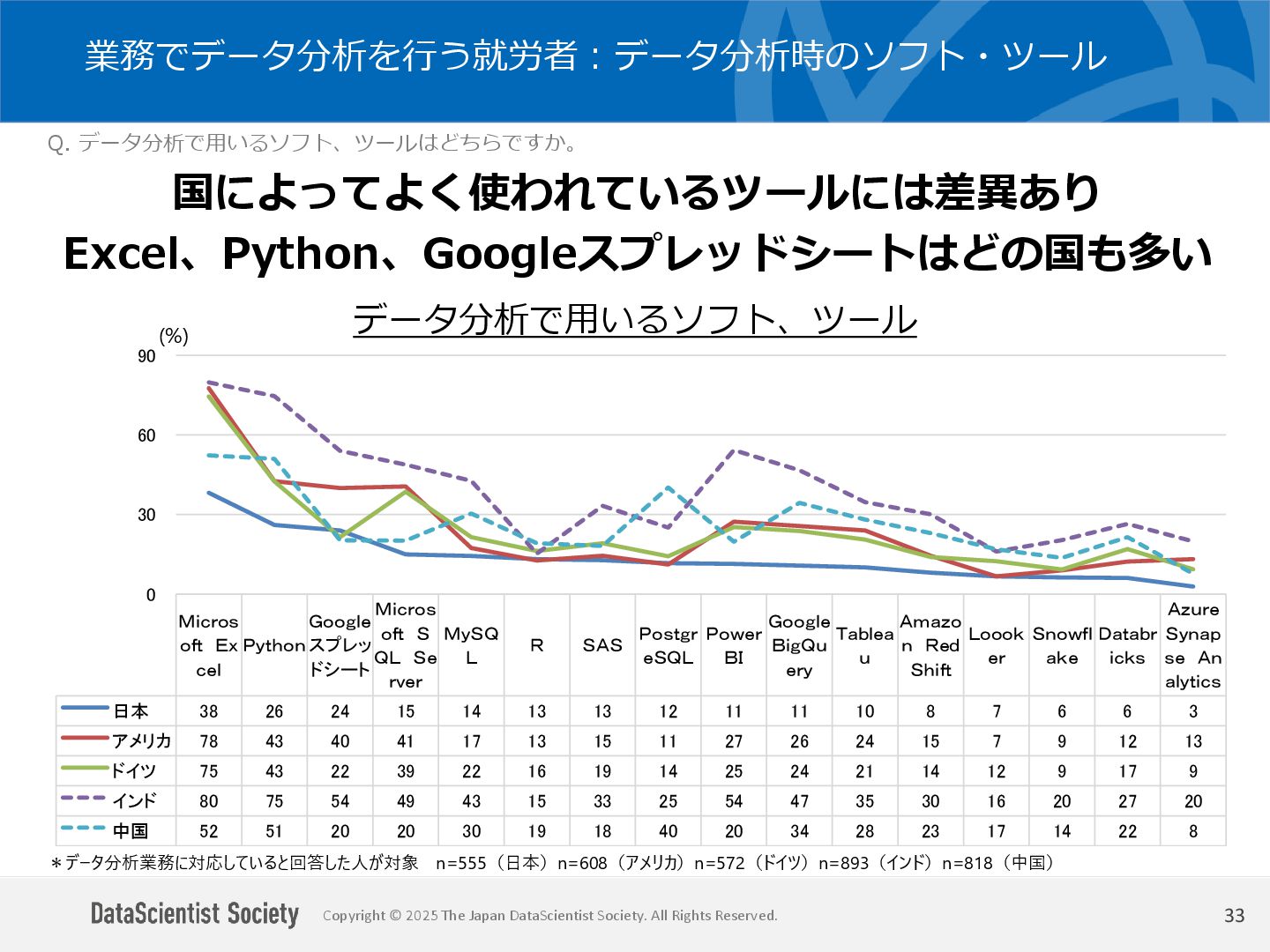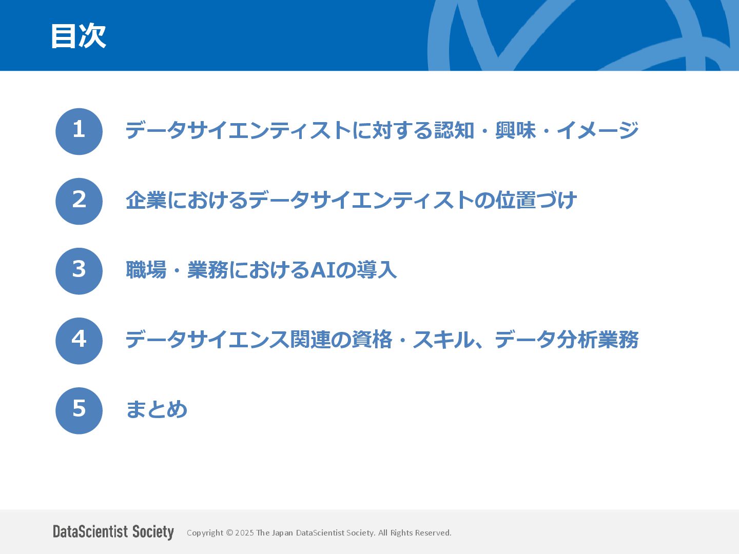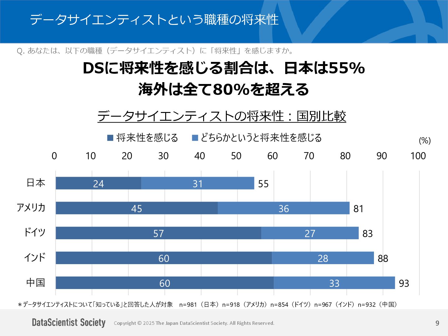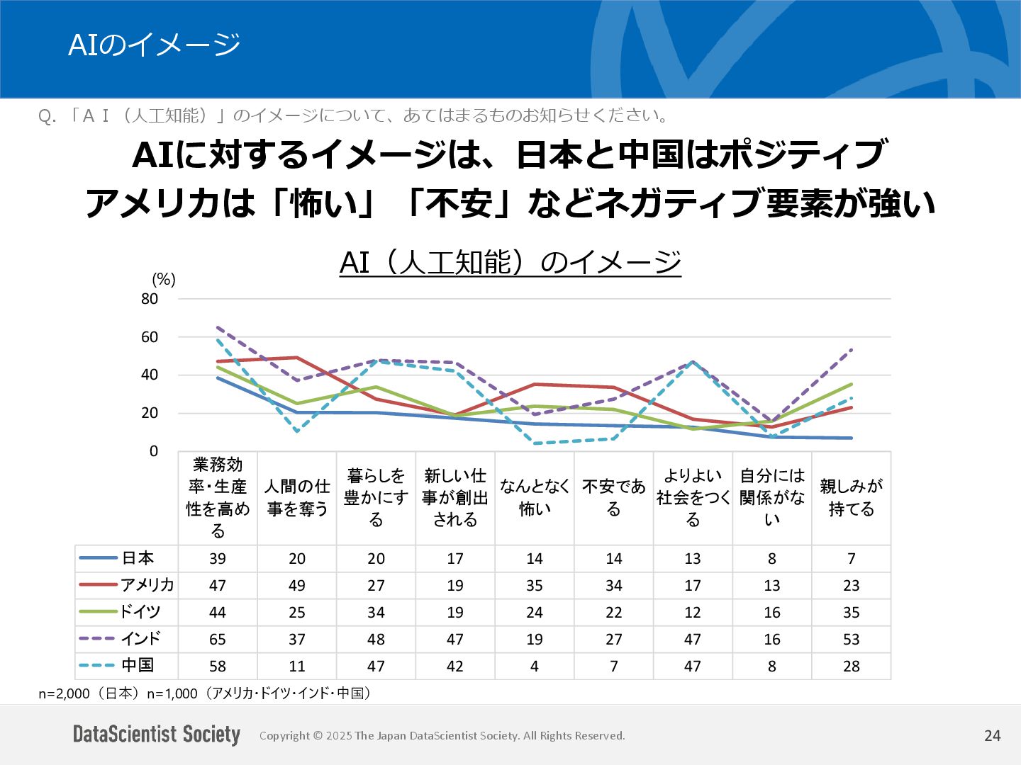 データサイエンティスト協会 調査・研究委員会(委員長:塩谷 周久)は、データサイエンス人材の需給バランス改善を目的に、認知・意識・活用実態を毎年調査しています。2025年は中国を加えた5カ国を対象に、データサイエンティストの社会的認知と生成AIの実務利用を国際比較しました。