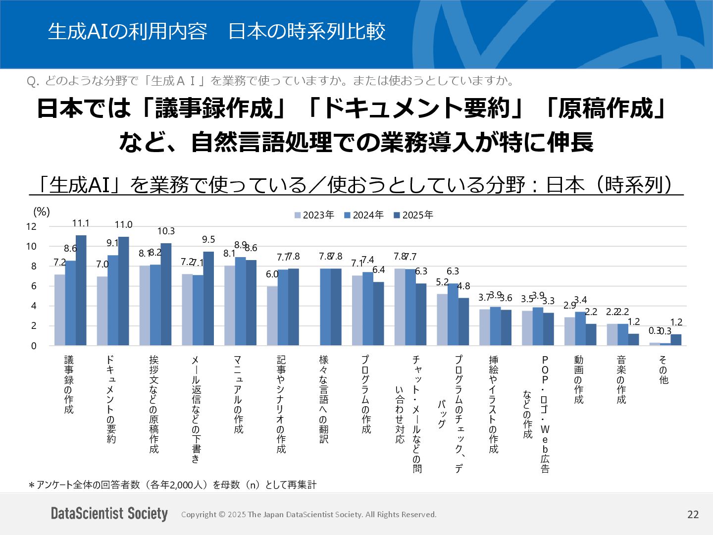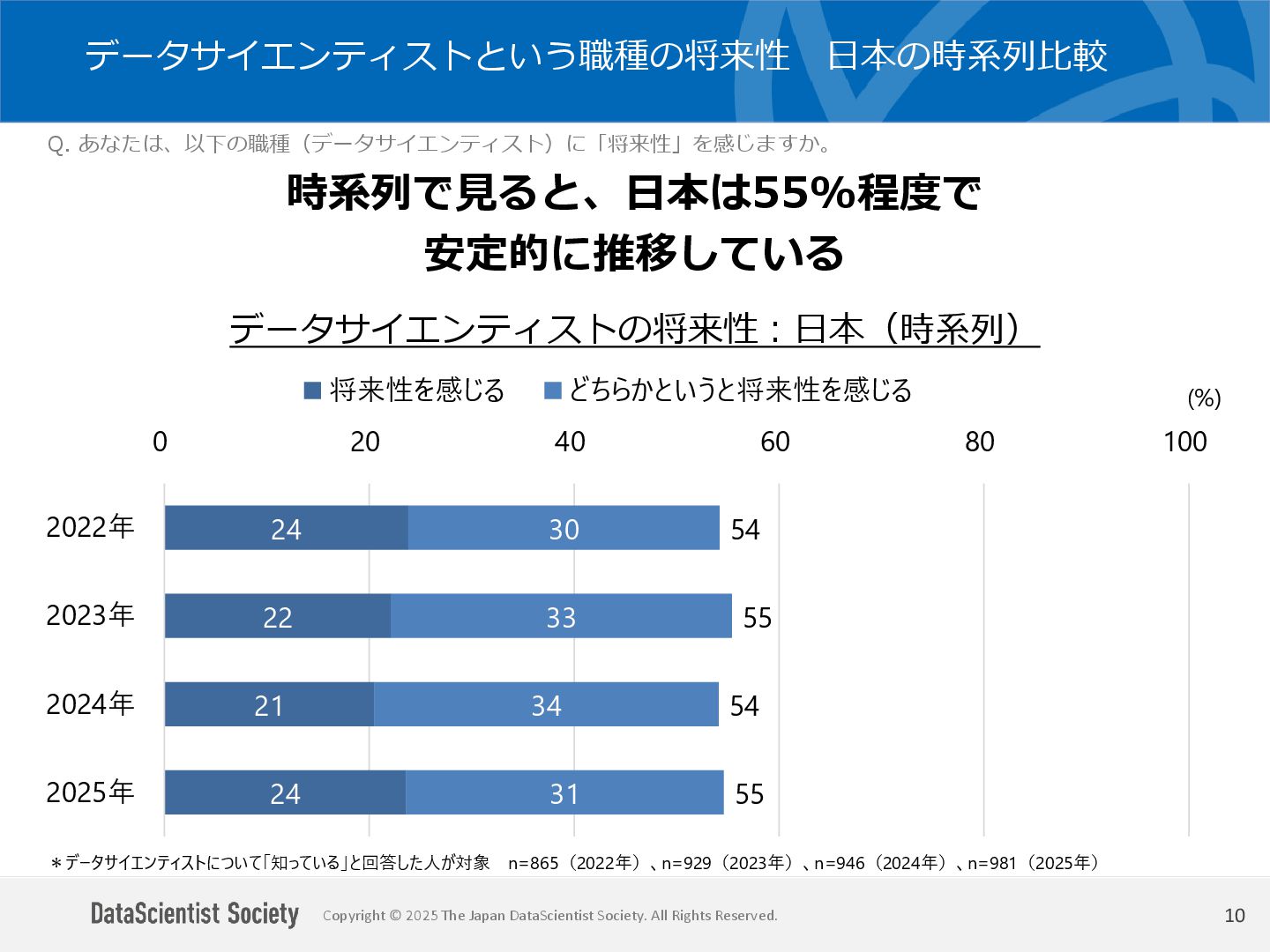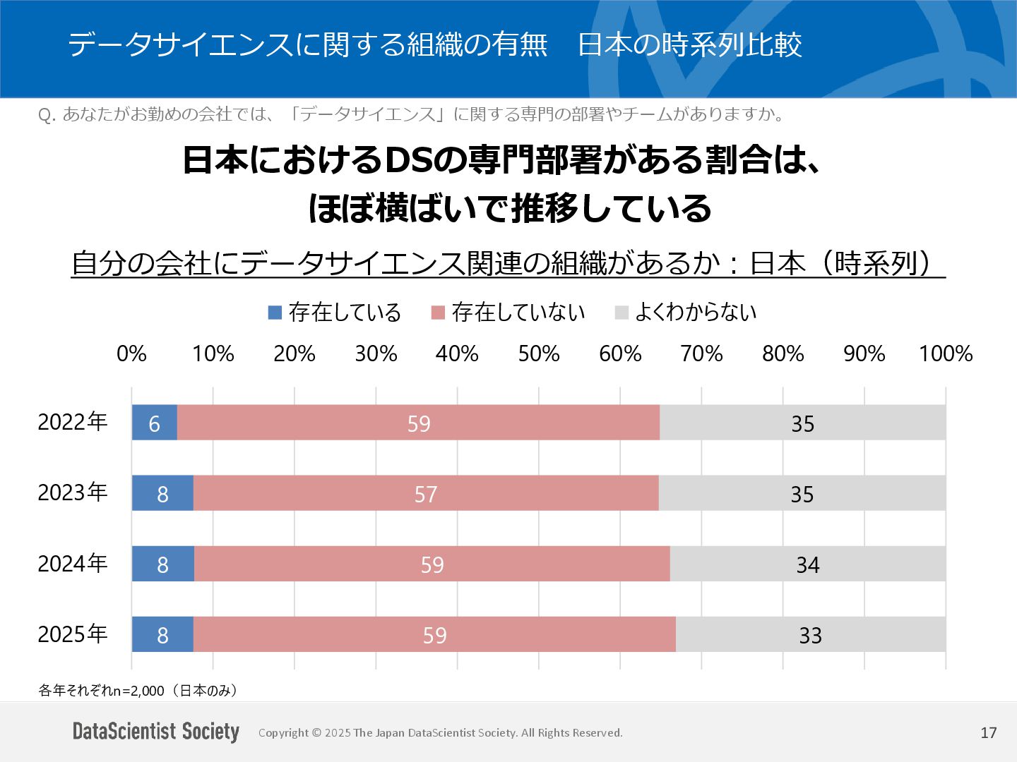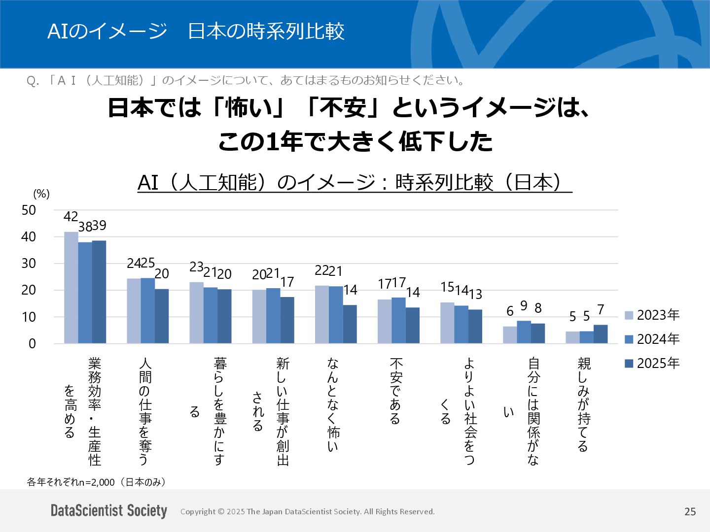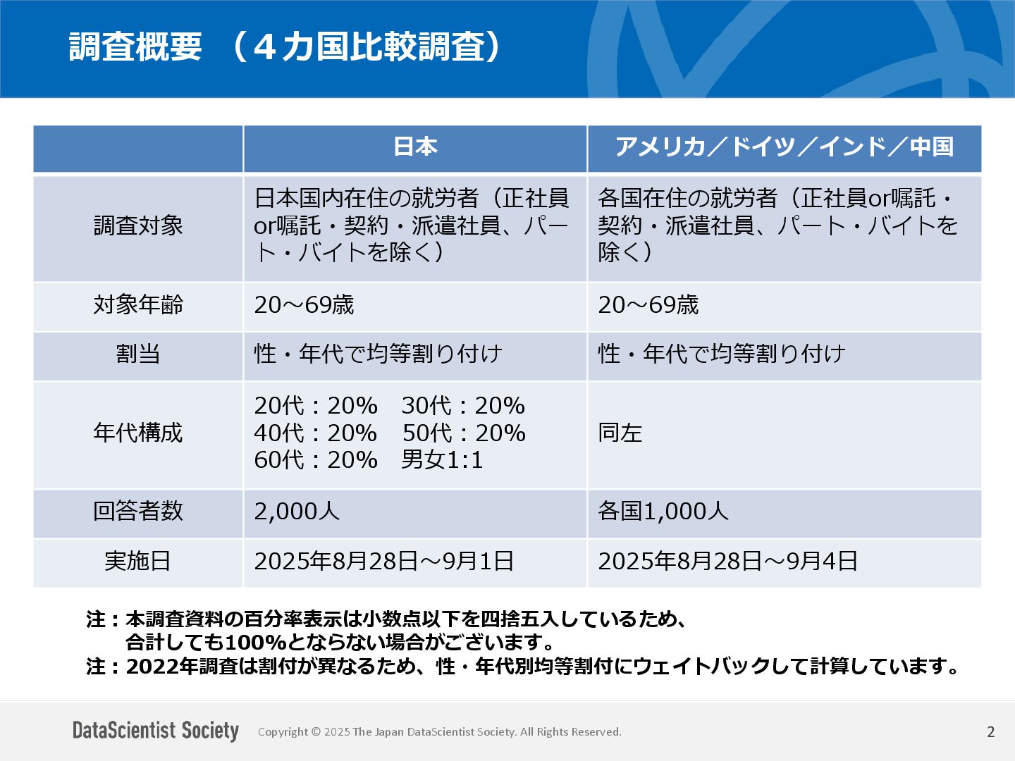 データサイエンティスト協会 調査・研究委員会(委員長:塩谷 周久)は、データサイエンス人材の需給バランス改善を目的に、認知・意識・活用実態を毎年調査しています。2025年は中国を加えた5カ国を対象に、データサイエンティストの社会的認知と生成AIの実務利用を国際比較しました。