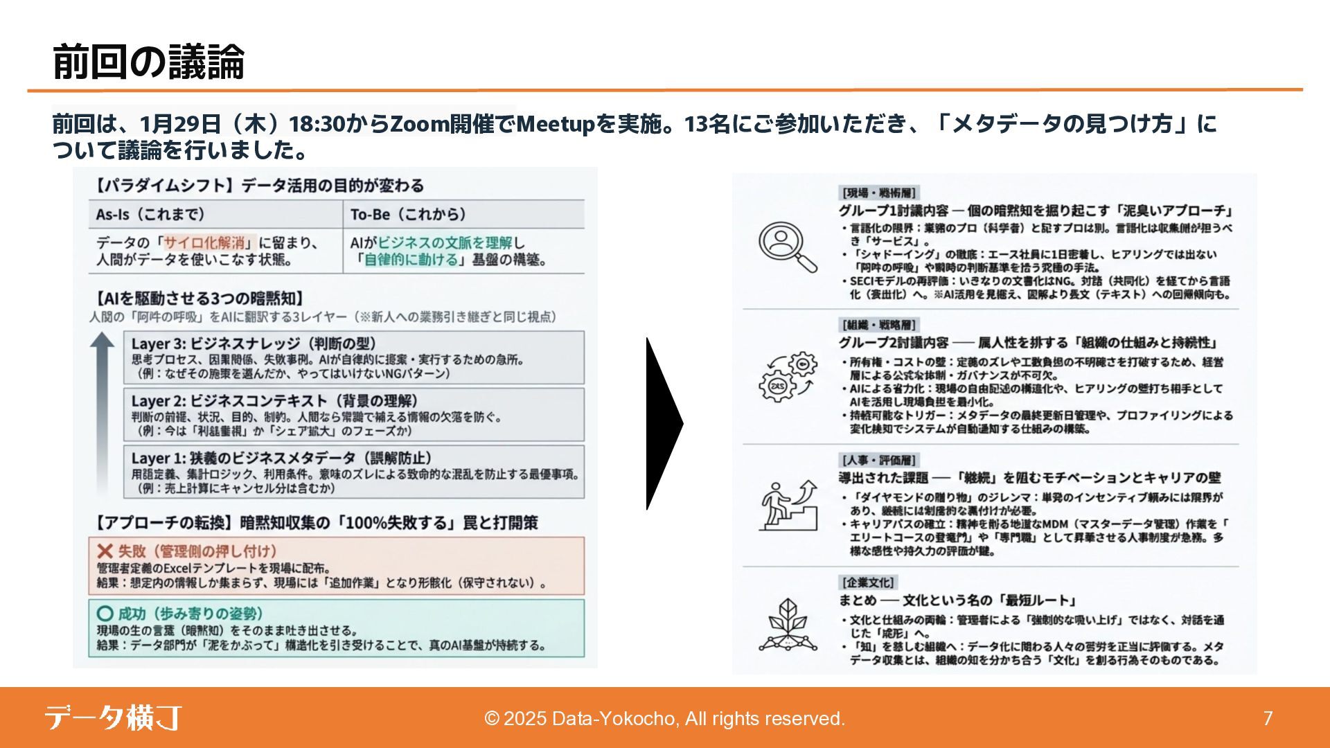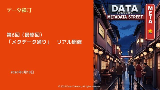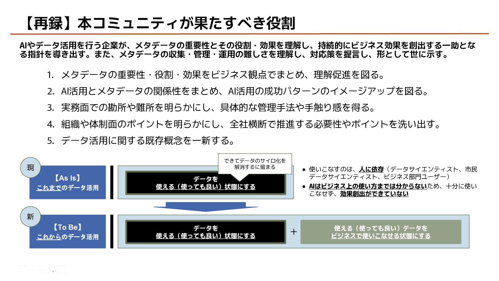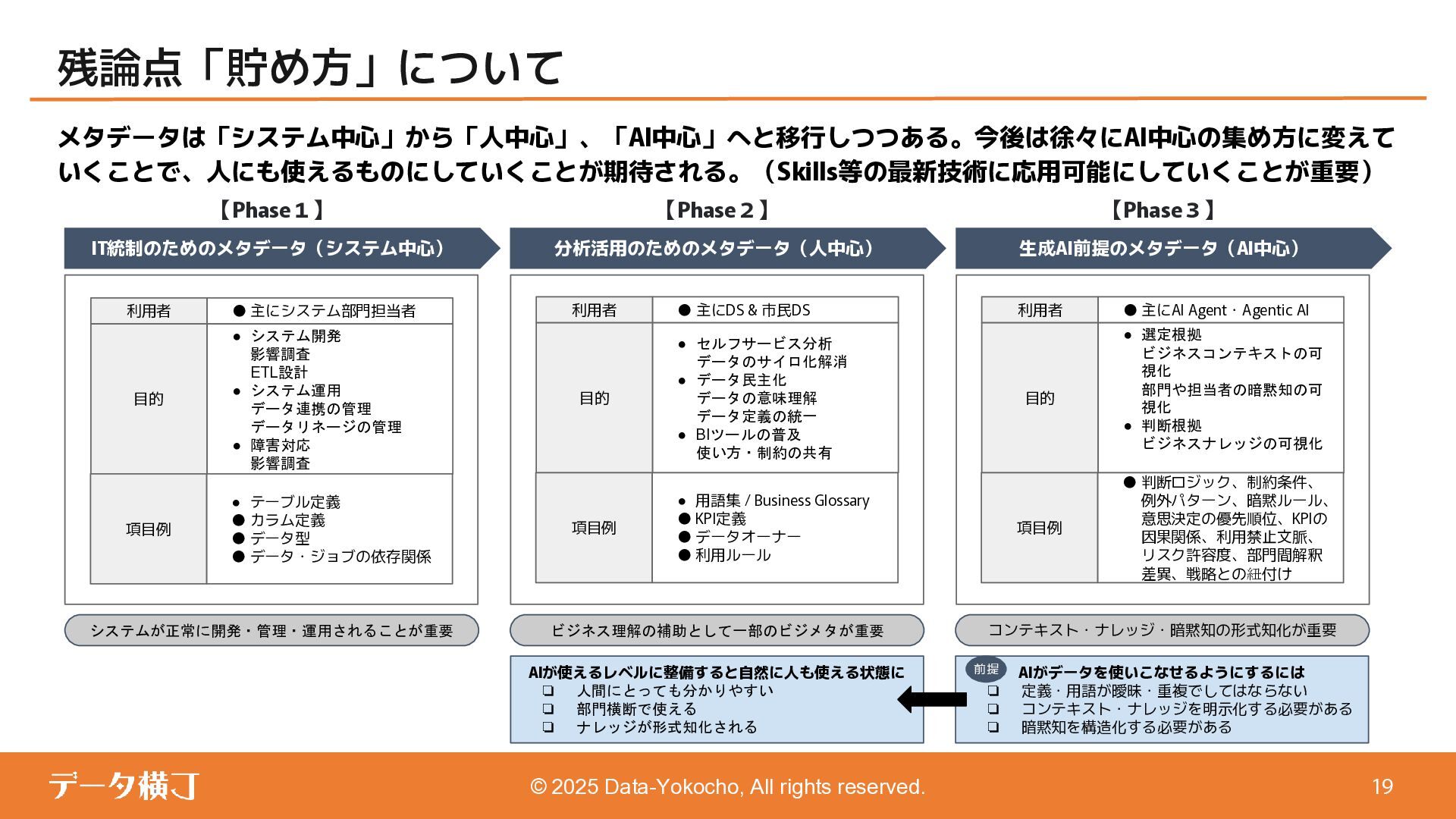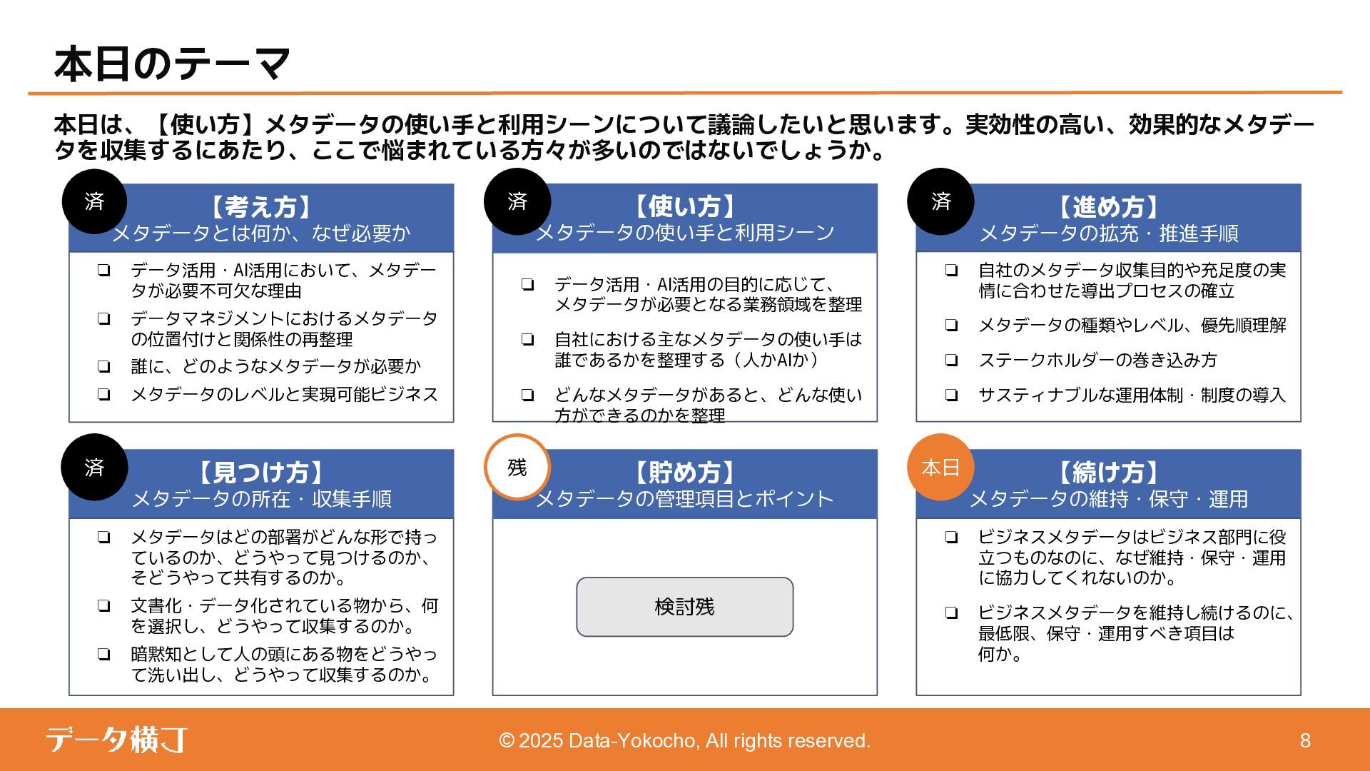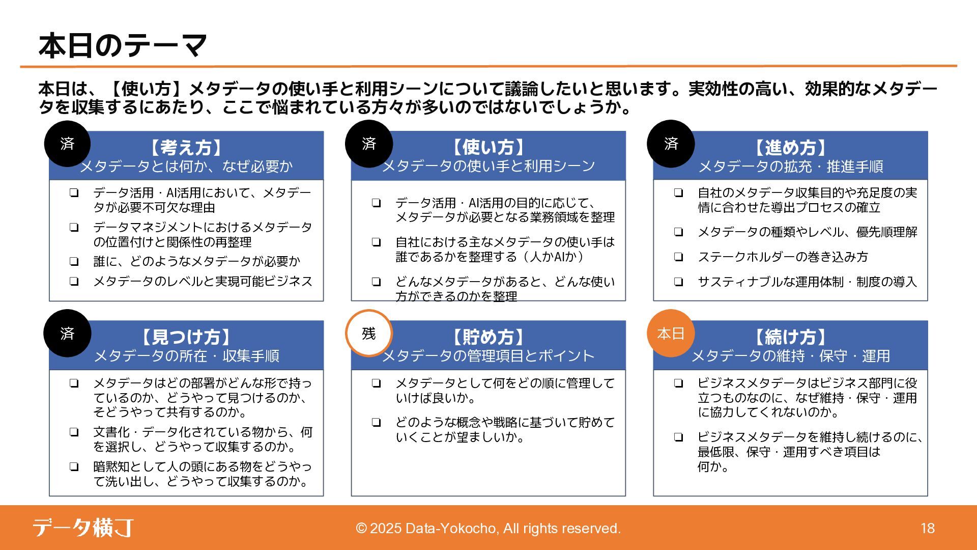 【貯め方】 メタデータの管理項目とポイント 【進め方】 メタデータの拡充・推進手順 ❏ データ活用・AI活用の目的に応じて、 メタデータが必要となる業務領域を整理 ❏ 自社における主なメタデータの使い手は 誰であるかを整理する(人かAIか) ❏ どんなメタデータがあると、どんな使い 方ができるのかを整理 【使い方】 メタデータの使い手と利用シーン 【考え方】 メタデータとは何か、なぜ必要か 【続け方】 メタデータの維持・保守・運用 ❏ 自社のメタデータ収集目的や充足度の実 情に合わせた導出プロセスの確立 ❏ メタデータの種類やレベル、優先順理解 ❏ ステークホルダーの巻き込み方 ❏ サスティナブルな運用体制・制度の導入 【見つけ方】 メタデータの所在・収集手順 済 ❏ データ活用・AI活用において、メタデー タが必要不可欠な理由 ❏ データマネジメントにおけるメタデータ の位置付けと関係性の再整理 ❏ 誰に、どのようなメタデータが必要か ❏ メタデータのレベルと実現可能ビジネス 済 済 済 残 本日 ❏ メタデータはどの部署がどんな形で持っ ているのか、どうやって見つけるのか、 そどうやって共有するのか。 ❏ 文書化・データ化されている物から、何 を選択し、どうやって収集するのか。 ❏ 暗黙知として人の頭にある物をどうやっ て洗い出し、どうやって収集するのか。 ❏ ビジネスメタデータはビジネス部門に役 立つものなのに、なぜ維持・保守・運用 に協力してくれないのか。 ❏ ビジネスメタデータを維持し続けるのに、 最低限、保守・運用すべき項目は 何か。 ❏ メタデータとして何をどの順に管理して いけば良いか。 ❏ どのような概念や戦略に基づいて貯めて いくことが望ましいか。