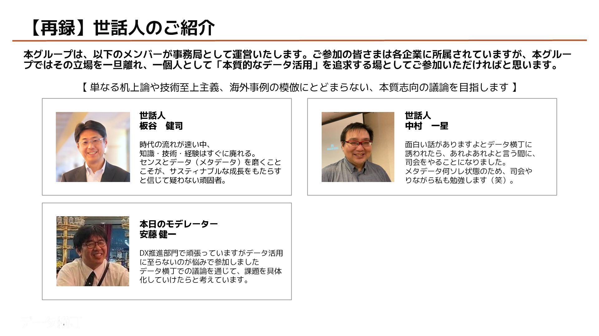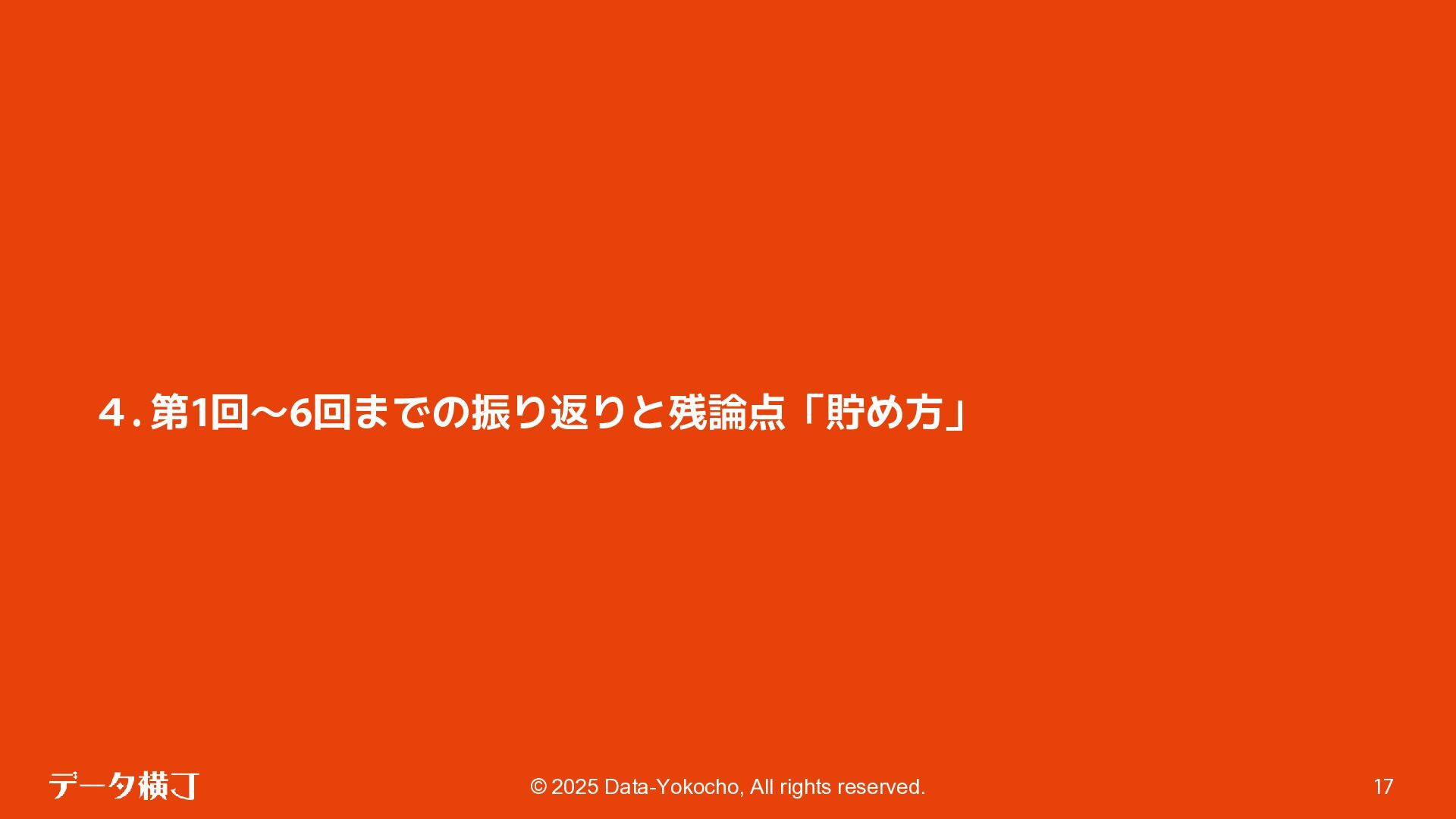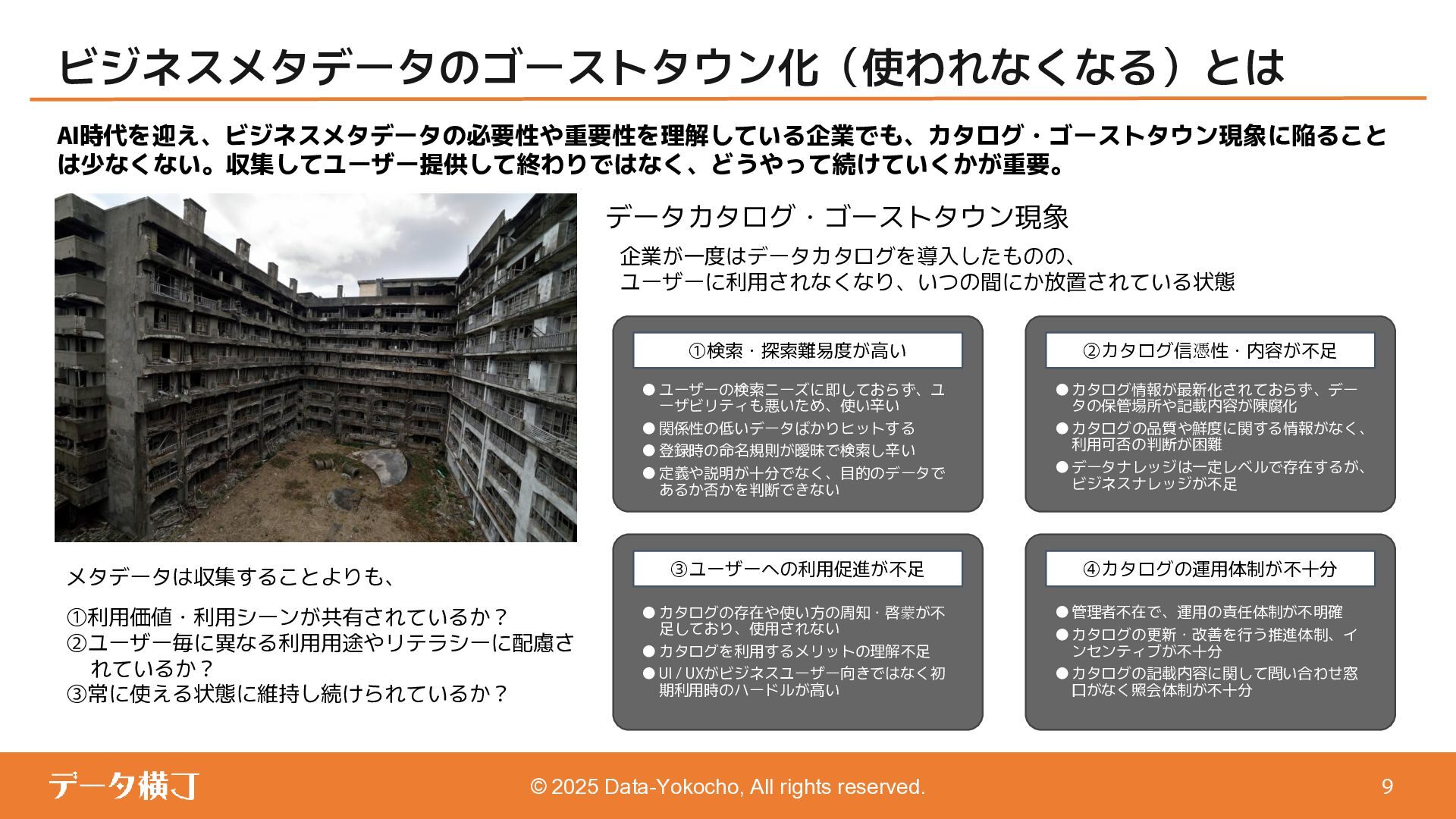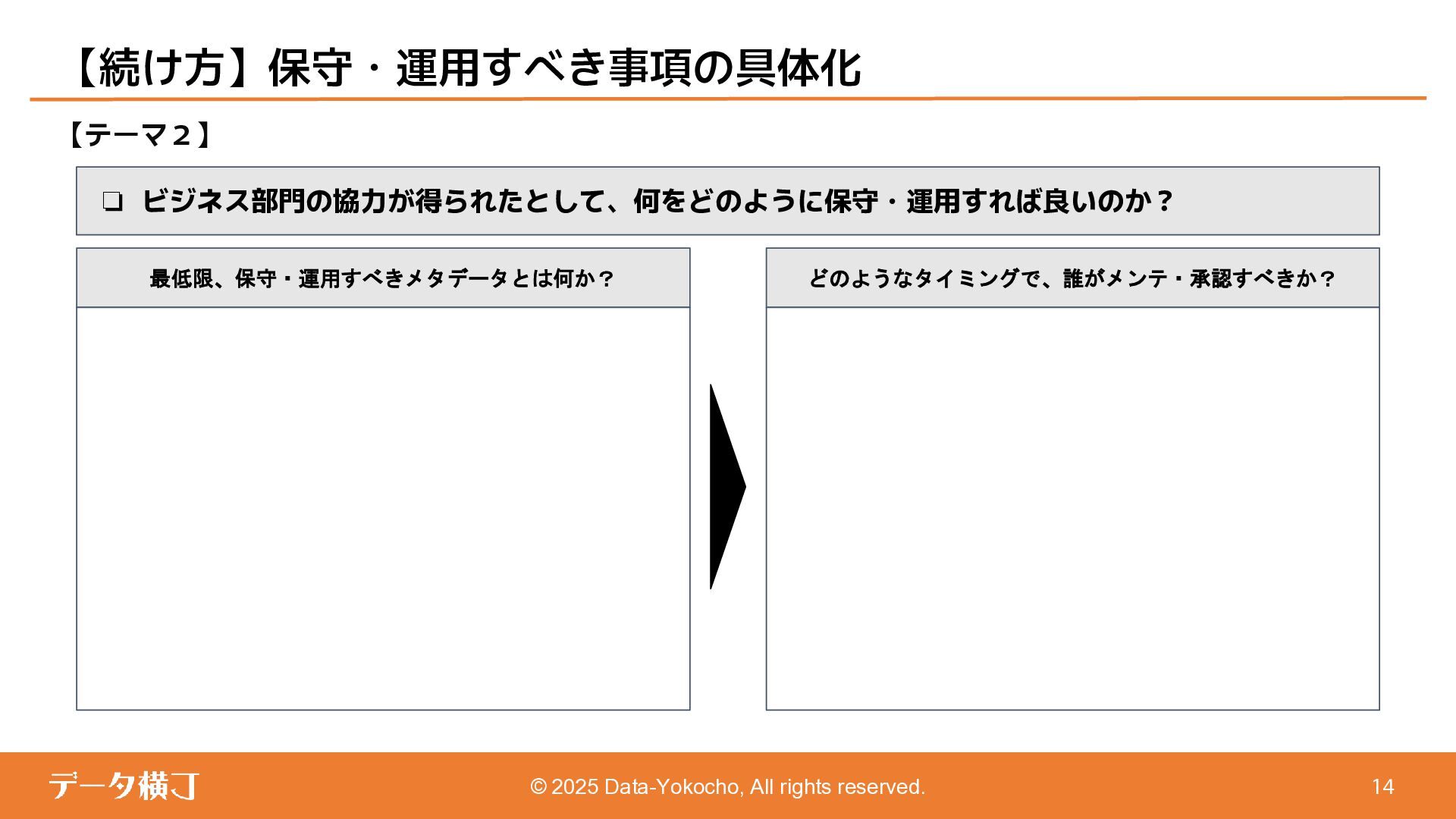 【貯め方】 メタデータの管理項目とポイント 【進め方】 メタデータの拡充・推進手順 ❏ データ活用・AI活用の目的に応じて、 メタデータが必要となる業務領域を整理 ❏ 自社における主なメタデータの使い手は 誰であるかを整理する(人かAIか) ❏ どんなメタデータがあると、どんな使い 方ができるのかを整理 【使い方】 メタデータの使い手と利用シーン 【考え方】 メタデータとは何か、なぜ必要か 【続け方】 メタデータの維持・保守・運用 ❏ 自社のメタデータ収集目的や充足度の実 情に合わせた導出プロセスの確立 ❏ メタデータの種類やレベル、優先順理解 ❏ ステークホルダーの巻き込み方 ❏ サスティナブルな運用体制・制度の導入 【見つけ方】 メタデータの所在・収集手順 済 ❏ データ活用・AI活用において、メタデー タが必要不可欠な理由 ❏ データマネジメントにおけるメタデータ の位置付けと関係性の再整理 ❏ 誰に、どのようなメタデータが必要か ❏ メタデータのレベルと実現可能ビジネス 済 済 済 残 本日 ❏ メタデータはどの部署がどんな形で持っ ているのか、どうやって見つけるのか、 そどうやって共有するのか。 ❏ 文書化・データ化されている物から、何 を選択し、どうやって収集するのか。 ❏ 暗黙知として人の頭にある物をどうやっ て洗い出し、どうやって収集するのか。 ❏ ビジネスメタデータはビジネス部門に役 立つものなのに、なぜ維持・保守・運用 に協力してくれないのか。 ❏ ビジネスメタデータを維持し続けるのに、 最低限、保守・運用すべき項目は 何か。 ❏ メタデータとして何をどの順に管理して いけば良いか。 ❏ どのような概念や戦略に基づいて貯めて いくことが望ましいか。