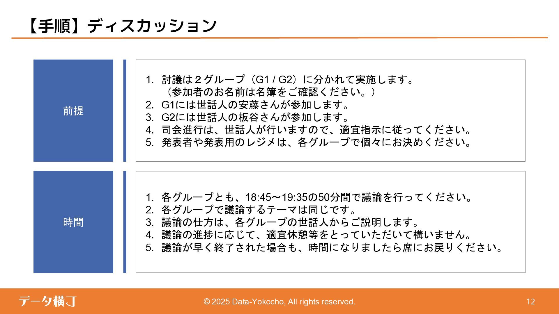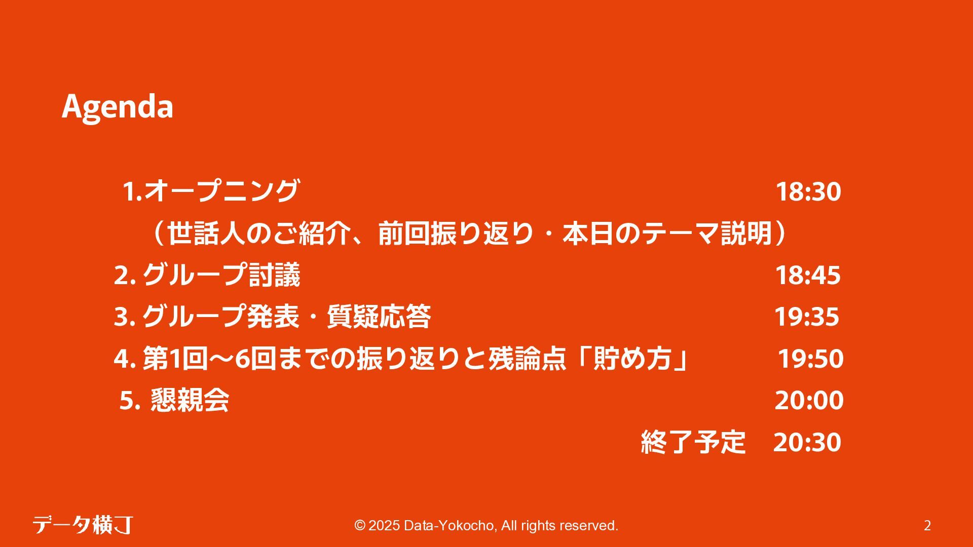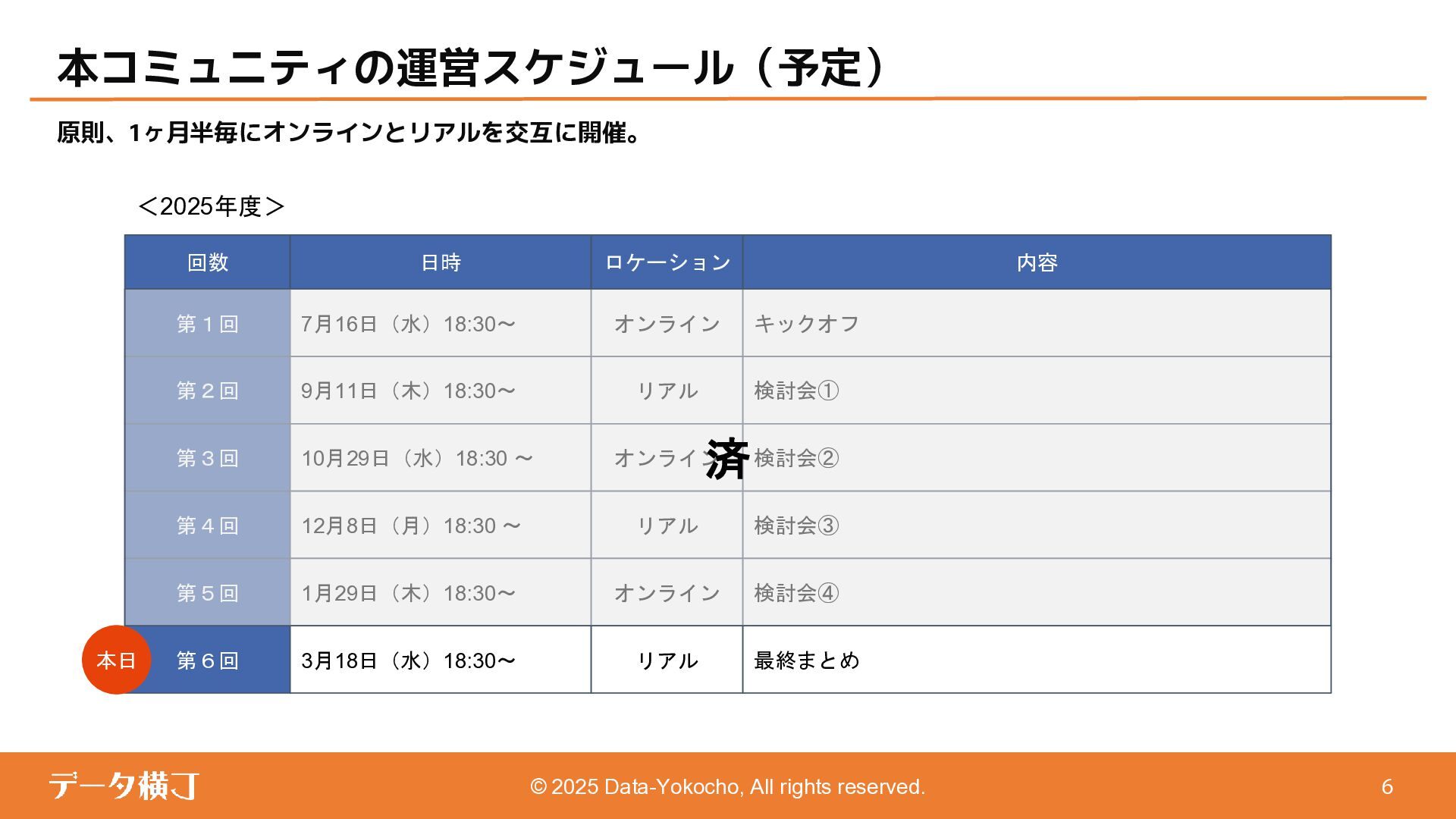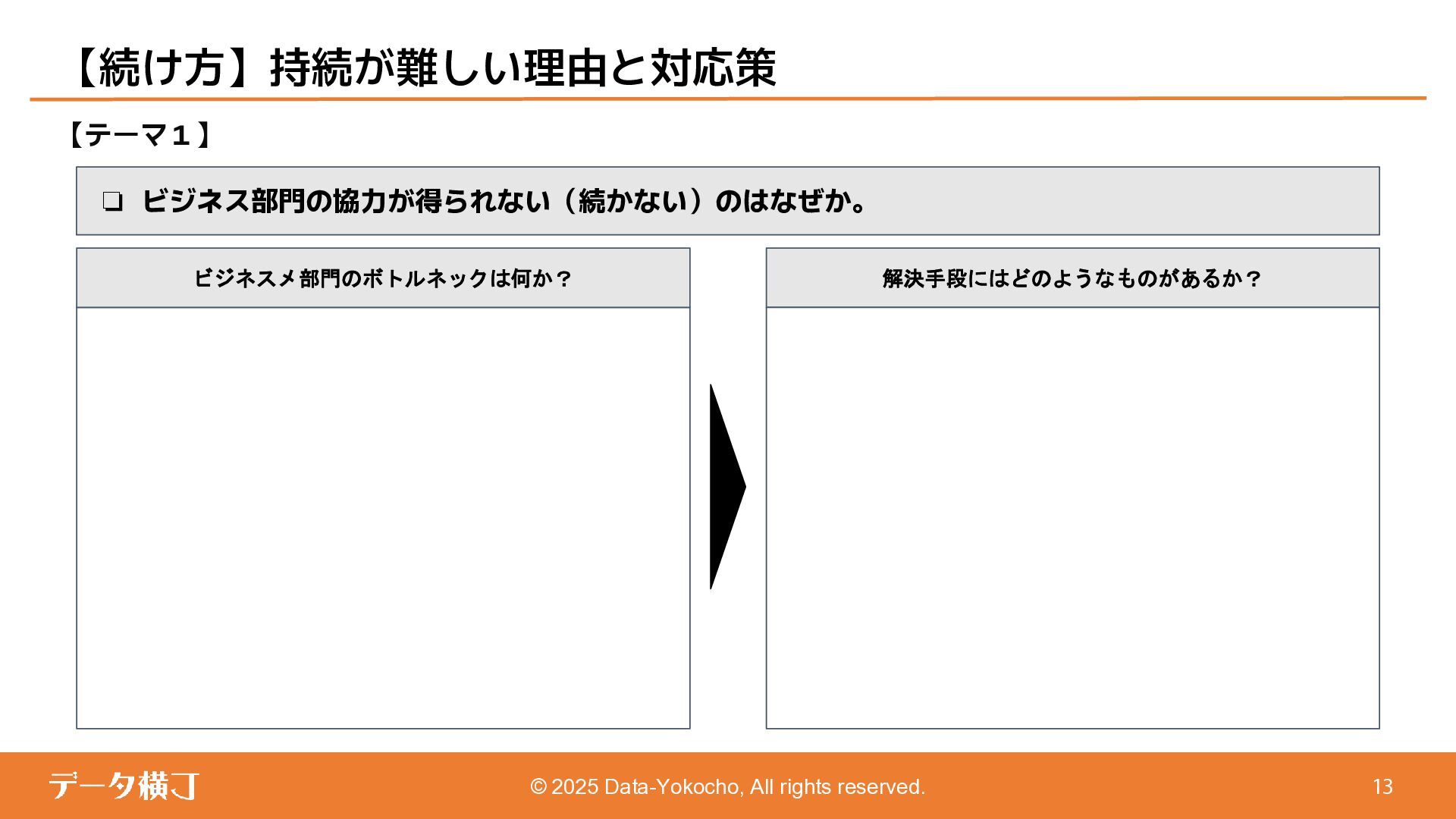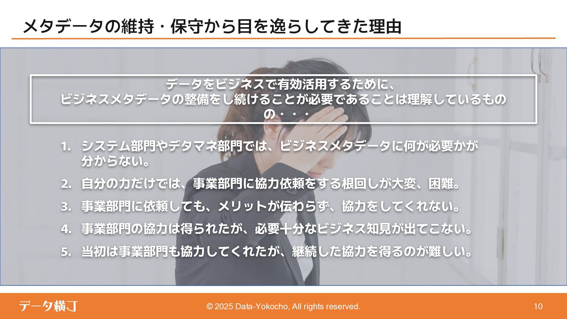 【貯め方】 メタデータの管理項目とポイント 【進め方】 メタデータの拡充・推進手順 ❏ データ活用・AI活用の目的に応じて、 メタデータが必要となる業務領域を整理 ❏ 自社における主なメタデータの使い手は 誰であるかを整理する(人かAIか) ❏ どんなメタデータがあると、どんな使い 方ができるのかを整理 【使い方】 メタデータの使い手と利用シーン 【考え方】 メタデータとは何か、なぜ必要か 【続け方】 メタデータの維持・保守・運用 ❏ 自社のメタデータ収集目的や充足度の実 情に合わせた導出プロセスの確立 ❏ メタデータの種類やレベル、優先順理解 ❏ ステークホルダーの巻き込み方 ❏ サスティナブルな運用体制・制度の導入 【見つけ方】 メタデータの所在・収集手順 済 ❏ データ活用・AI活用において、メタデー タが必要不可欠な理由 ❏ データマネジメントにおけるメタデータ の位置付けと関係性の再整理 ❏ 誰に、どのようなメタデータが必要か ❏ メタデータのレベルと実現可能ビジネス 済 済 済 残 本日 ❏ メタデータはどの部署がどんな形で持っ ているのか、どうやって見つけるのか、 そどうやって共有するのか。 ❏ 文書化・データ化されている物から、何 を選択し、どうやって収集するのか。 ❏ 暗黙知として人の頭にある物をどうやっ て洗い出し、どうやって収集するのか。 ❏ ビジネスメタデータはビジネス部門に役 立つものなのに、なぜ維持・保守・運用 に協力してくれないのか。 ❏ ビジネスメタデータを維持し続けるのに、 最低限、保守・運用すべき項目は 何か。 ❏ メタデータとして何をどの順に管理して いけば良いか。 ❏ どのような概念や戦略に基づいて貯めて いくことが望ましいか。