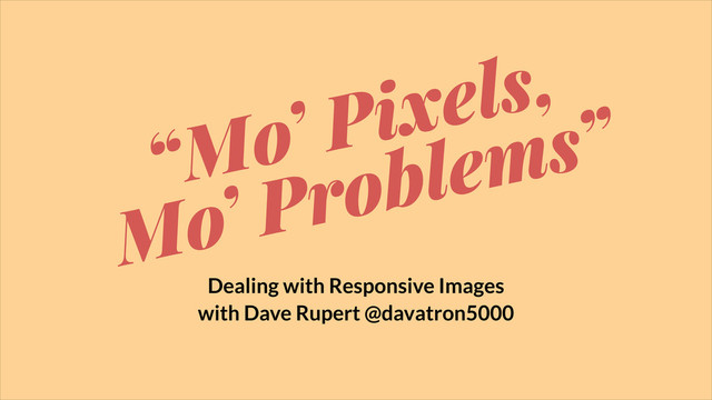 The Fall 2013 edition of "Mo Pixels Mo Problems" and how to deal with Responsive Images given at Artifact Conf East (http://artifactconf.com) in Providence, RI. The topic has changed a lot since the last time and there are even more options out there... so crack a beer and let's go on a journey.