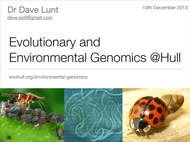 Dr Bernd Hänfling Dr Domino Joyce Dr Darren Evans Dr Dave Lunt Dr Lori Lawson Handley Bioinformatics, Next Gen sequencing, DNA metabarcoding, phylogenomics, Ecological networks, conservation biology Invasive species, population genetics, phylogeography, conservation biology Speciation, adaptive radiations, hybridisation, behavioural biology Invasive species, ladybirds, dispersal and colonisation Phylogeography, dispersal and gene flow, cryptic species, sexual systems