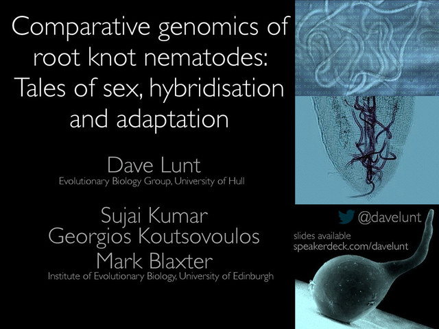 Sujai Kumar Comparative genomics of root knot nematodes: Tales of sex, hybridisation and adaptation Evolutionary Biology Group, University of Hull Institute of Evolutionary Biology, University of Edinburgh [email protected] davelunt.net