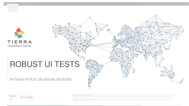 property of Tierra and is not to be disclosed without the written consent of Tierra. No part of this publication may be reproduced or transmitted in any form or by any means including electronic storage, reproduction, execution or transmission without the prior written consent of Tierra. The recipient of this document by its retention and use agrees to respect the security status of the information contained herein. This document is intended for limited circulation. The information contained in this document is subject to change without notice and should not be construed as a commitment by Tierra unless such commitment is expressly given in a covering document. PYTHON PYTEST SELENIUM SPLINTER 2017/04/08 Floren ce ROBUST UI TESTS