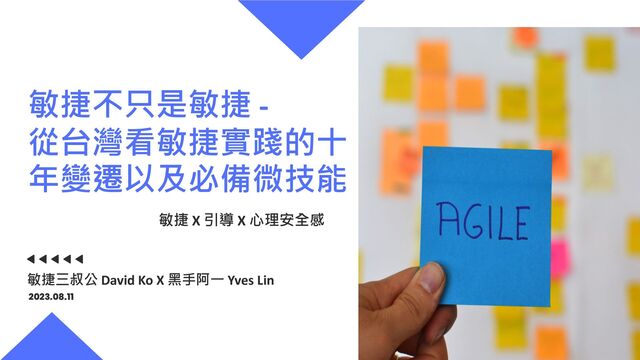 敏捷不只是敏捷 - 從台灣看敏捷實踐的十 年變遷以及必備微技能 敏捷 X 引導 X 心理安全感 敏捷三叔公