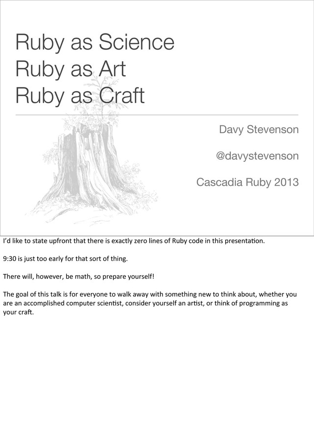 Programming sits at the intersection of science, art, and craft. I contend that, given introspection on each of these facets, we will all improve. I’ll provide concrete examples of how to apply formal Computer Science techniques to real-world problems. I’ll outline the benefits of treating code as an art form. I’ll explain how problem solving in programming maps directly onto other crafty domains. But most importantly I’ll discuss the importance of taking the time to look at problems from different perspectives. No matter what path you have taken, there is always more to be learned by walking in the footsteps of another.