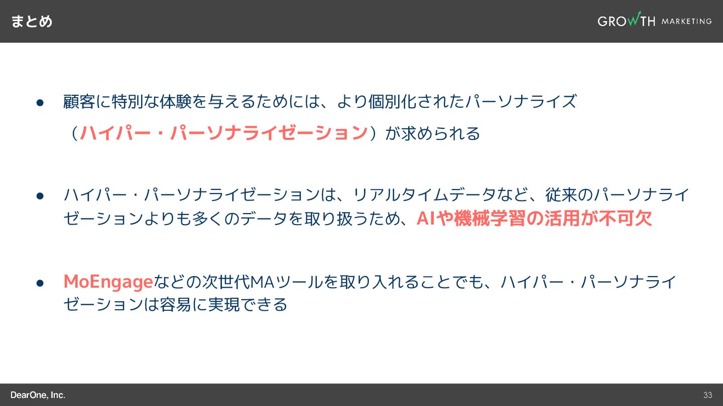 その一方で、MAツールを活用したマーケティング施策のパーソナライズ化は、今後ますます求められていきます。すでに、海外や一部の国内企業では「ハイパー・パーソナライゼーション」という、AIや機械学習、リアルタイムデータを活用し、これまでのパーソナライズをより進化させる取り組みも行われています。