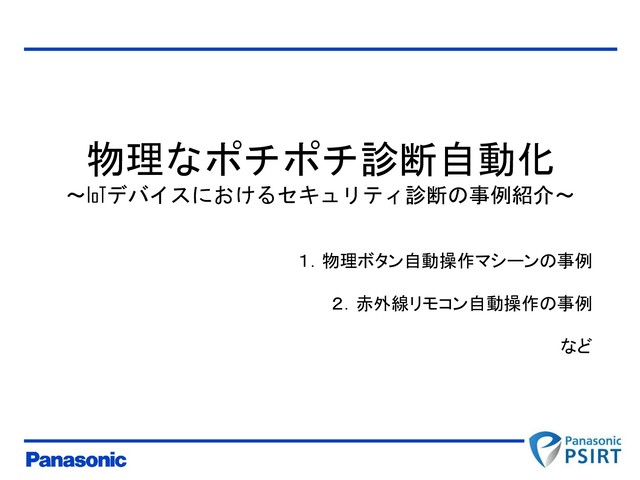 物理なポチポチ診断自動化 ~IoTデバイスにおけるセキュリティ診断の事例紹介~ 1.物理ボタン自動操作マシーンの事例 2.赤外線リモコン自動操作の事例 など