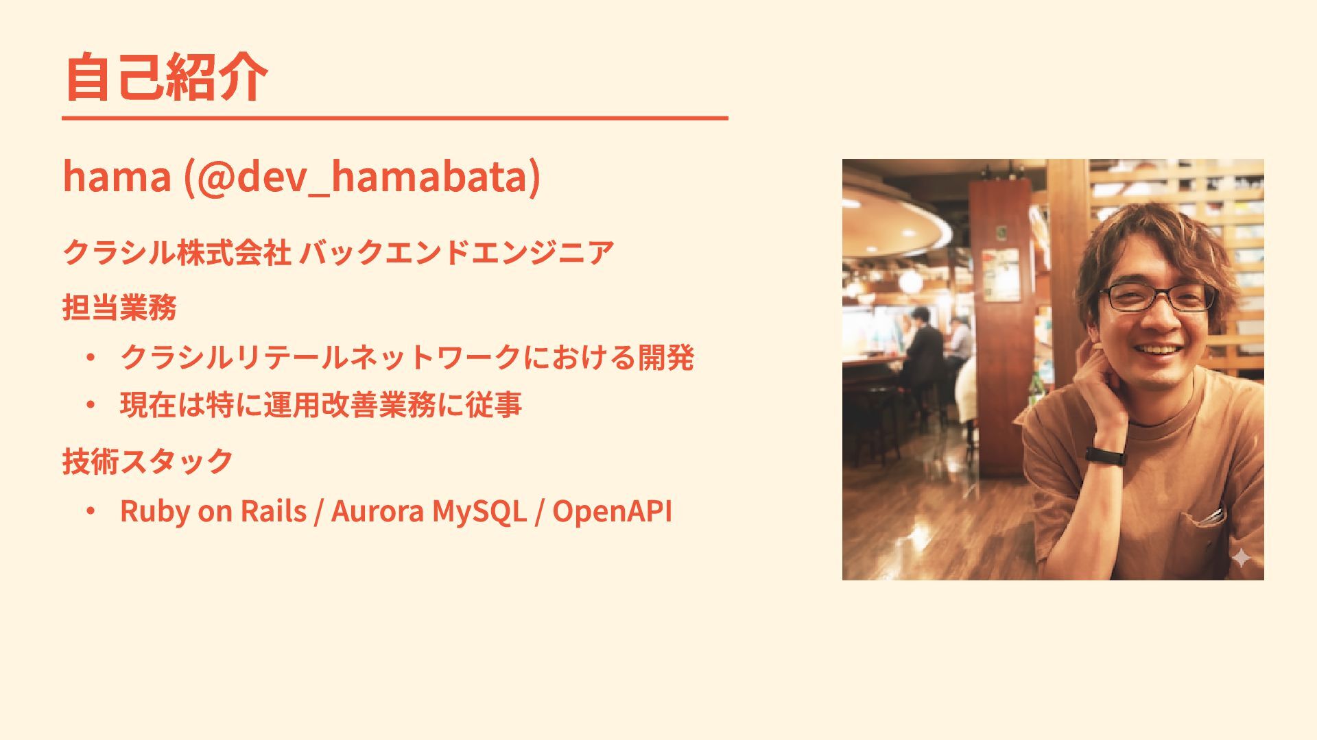 自己紹介 hama (@dev_hamabata) クラシル株式会社 バックエンドエンジニア 担当業務 ・ クラシルリテールネットワークにおける開発 ・ 現在は特に運用改善業務に従事