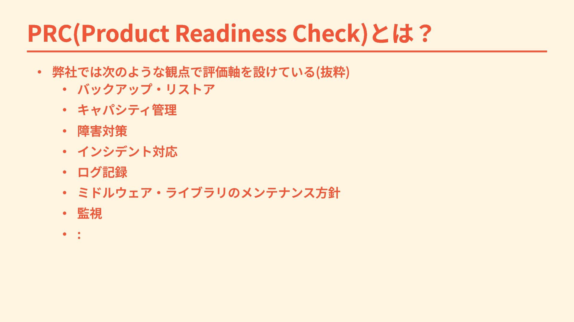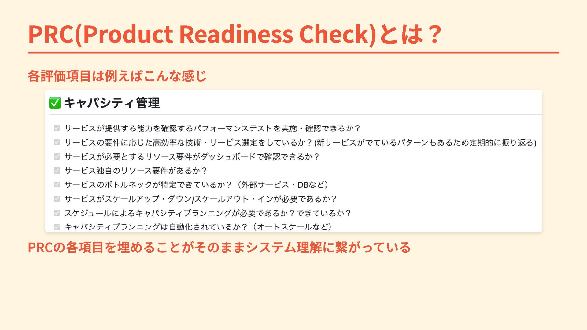 PRC(Product Readiness Check)とは? 各評価項目は例えばこんな感じ PRCの各項目を埋めることがそのままシステム理解に繋がっている