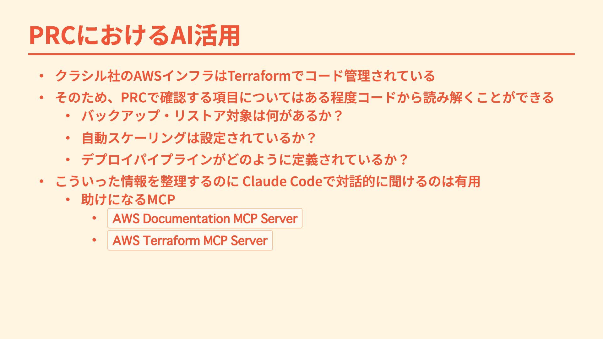 PRCにおけるAI活用 ・ クラシル社のAWSインフラはTerraformでコード管理されている ・ そのため、PRCで確認する項目についてはある程度コードから読み解くことができる ・ バックアップ・リストア対象は何があるか? ・ 自動スケーリングは設定されているか? ・