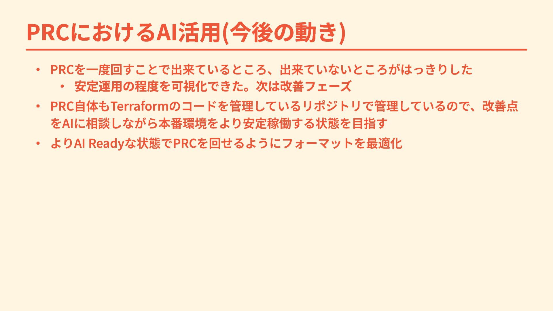 PRCにおけるAI活用(今後の動き) ・ PRCを一度回すことで出来ているところ、出来ていないところがはっきりした ・ 安定運用の程度を可視化できた。次は改善フェーズ ・ PRC自体もTerraformのコードを管理しているリポジトリで管理しているので、改善点 をAIに相談しながら本番環境をより安定稼働する状態を目指す ・ よりAI
