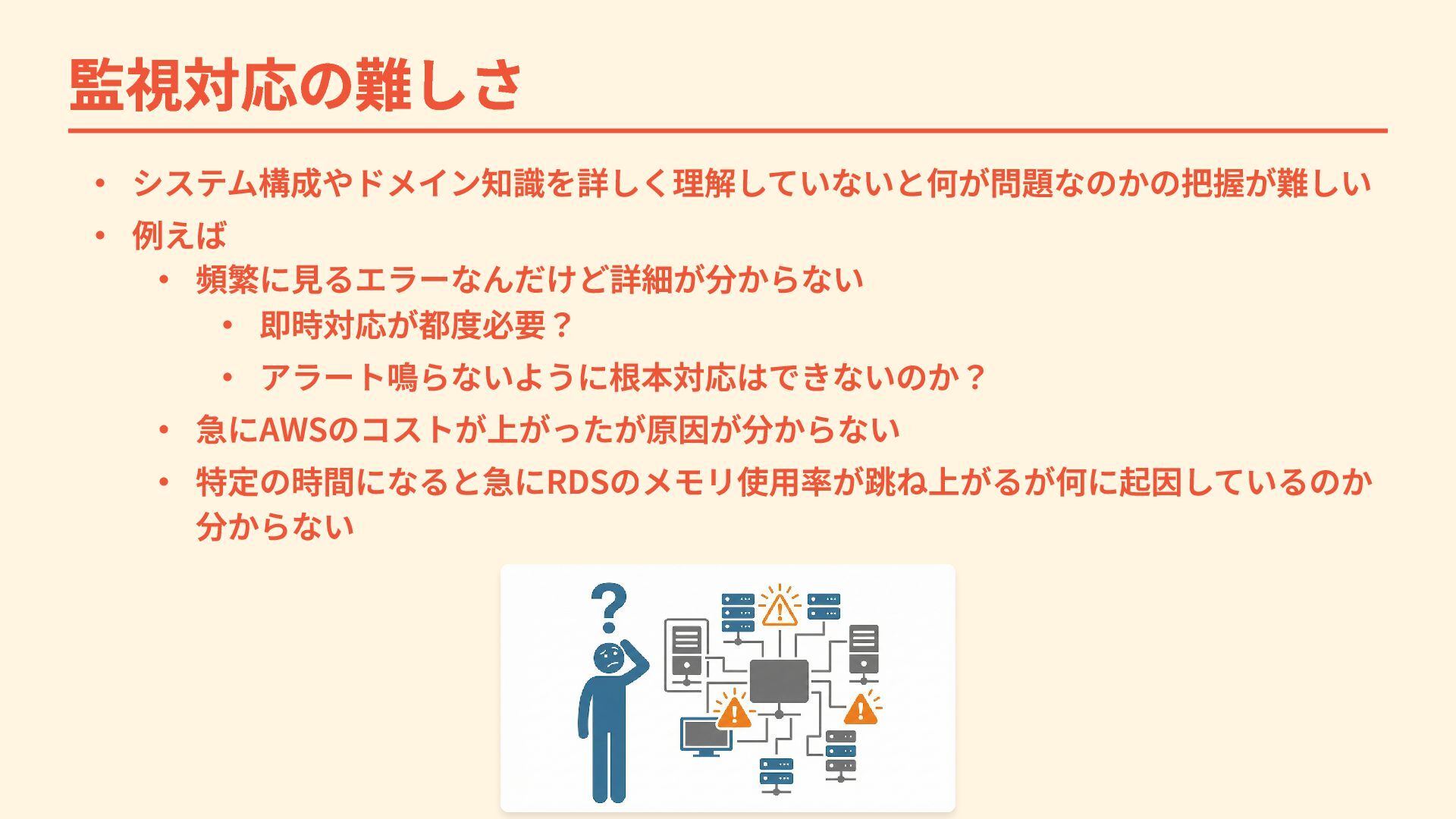 監視対応の難しさ ・ システム構成やドメイン知識を詳しく理解していないと何が問題なのかの把握が難しい ・ 例えば ・ 頻繁に見るエラーなんだけど詳細が分からない ・ 即時対応が都度必要? ・