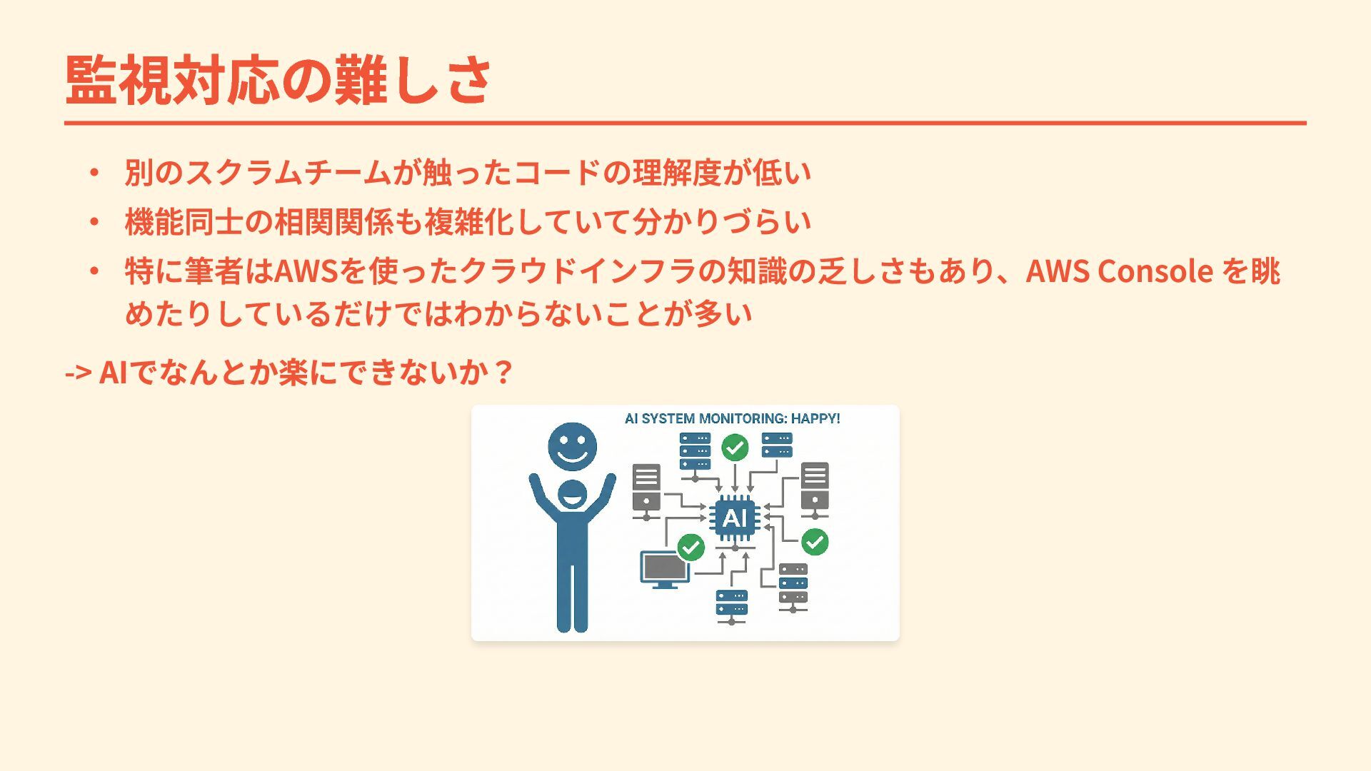 監視対応の難しさ ・ 別のスクラムチームが触ったコードの理解度が低い ・ 機能同士の相関関係も複雑化していて分かりづらい ・ 特に筆者はAWSを使ったクラウドインフラの知識の乏しさもあり、AWS Console を眺 めたりしているだけではわからないことが多い