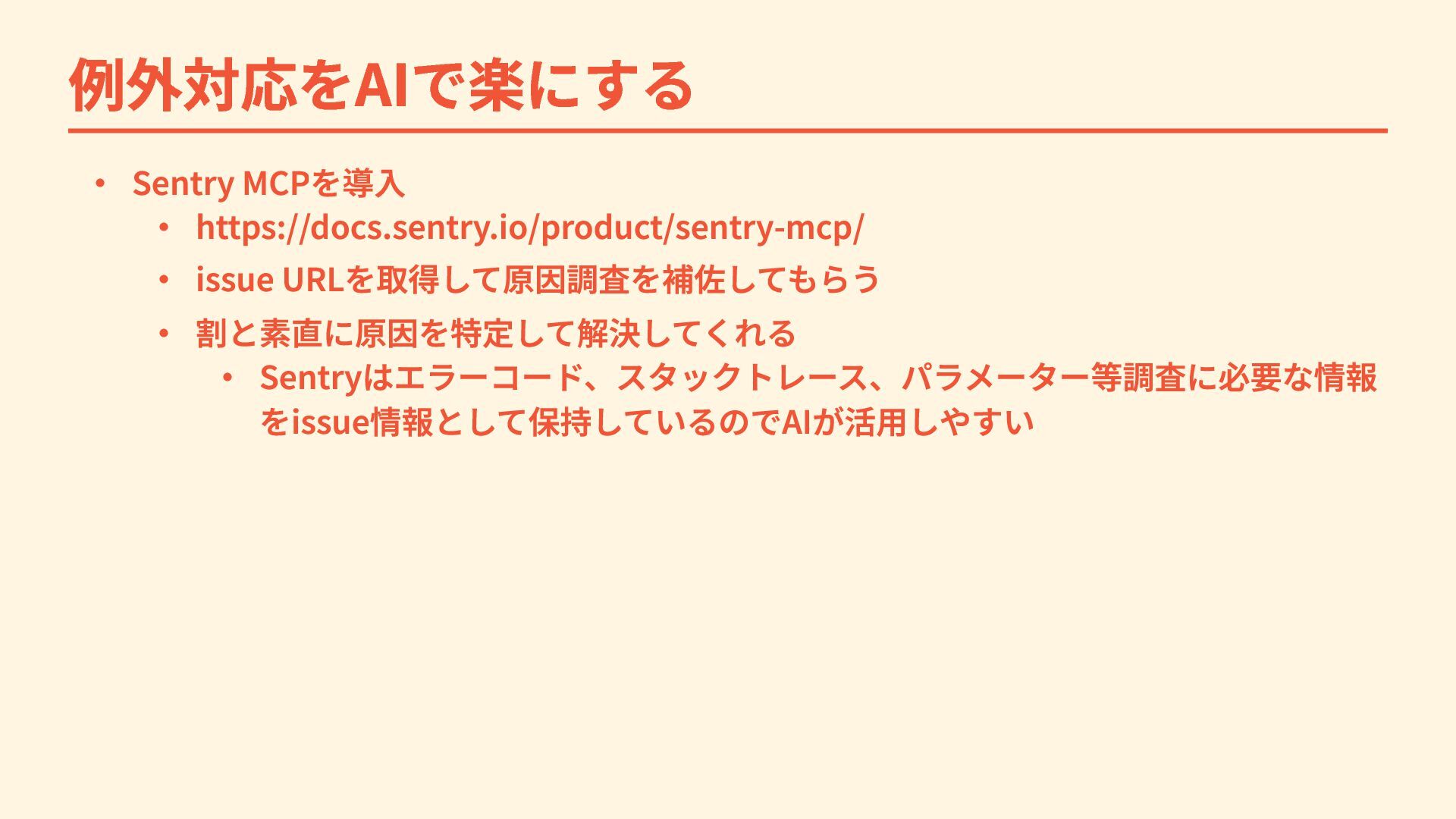 例外対応をAIで楽にする ・ Sentry MCPを導入 ・ https://docs.sentry.io/product/sentry-mcp/ ・ issue URLを取得して原因調査を補佐してもらう ・