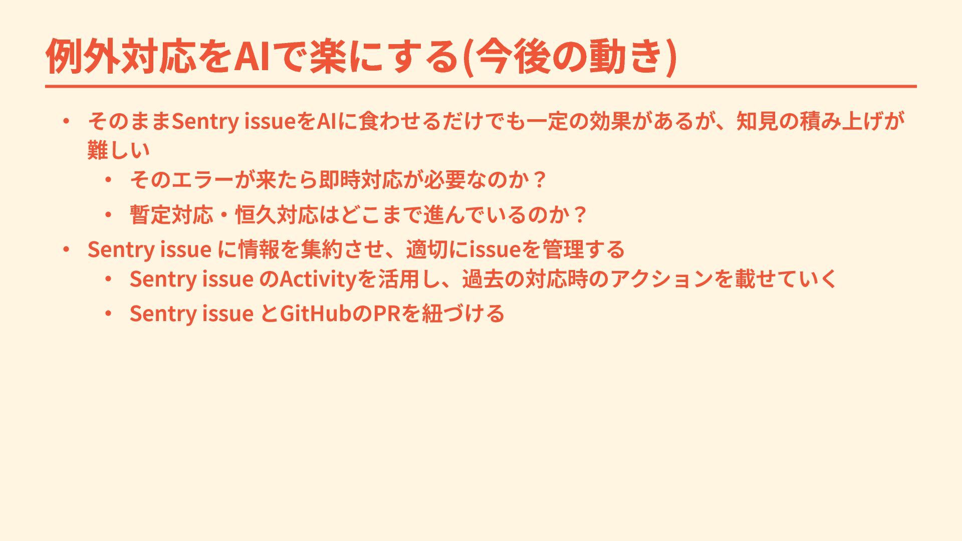 例外対応をAIで楽にする(今後の動き) ・ そのままSentry issueをAIに食わせるだけでも一定の効果があるが、知見の積み上げが 難しい ・ そのエラーが来たら即時対応が必要なのか? ・ 暫定対応・恒久対応はどこまで進んでいるのか? ・