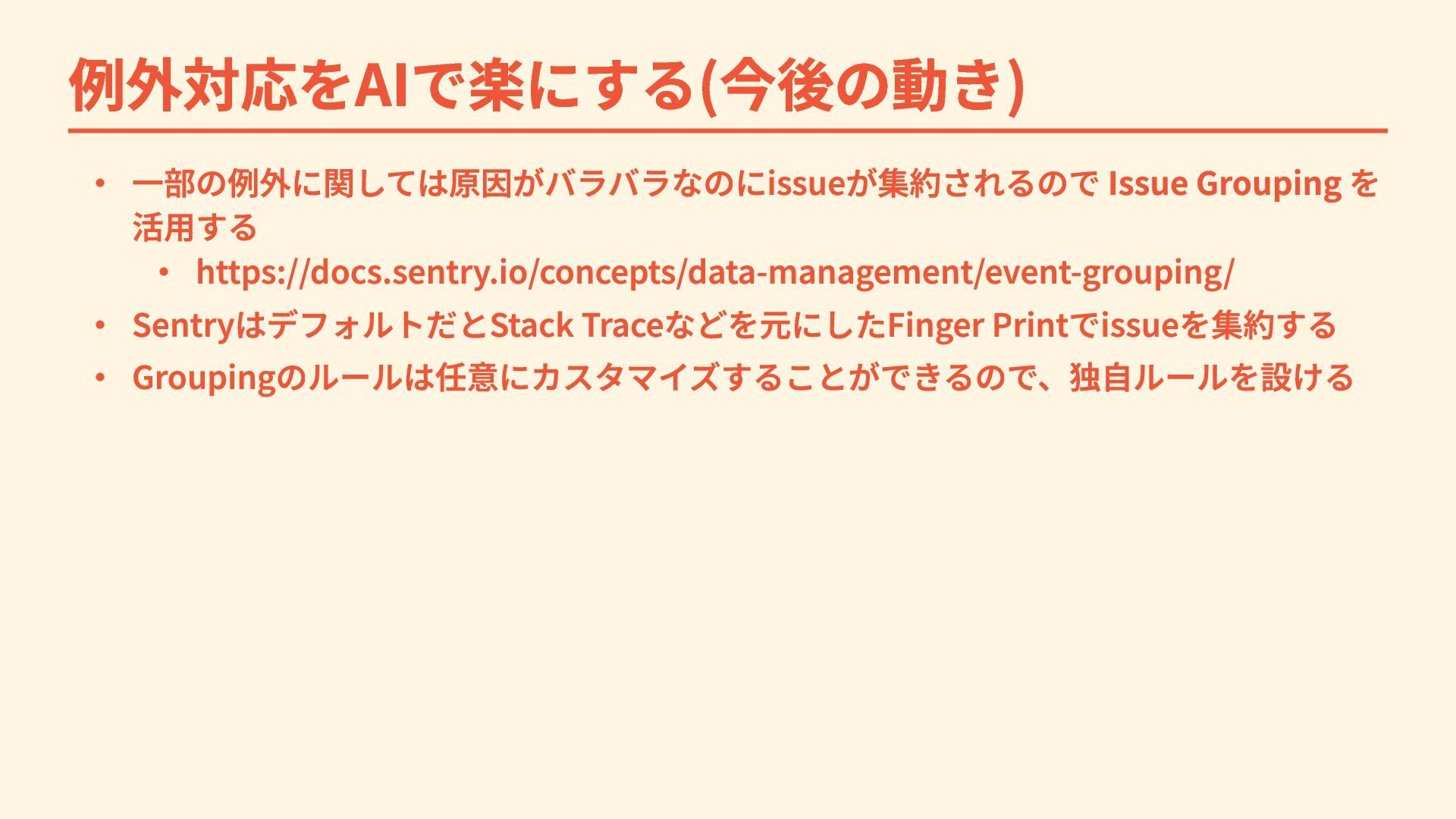 例外対応をAIで楽にする(今後の動き) ・ 一部の例外に関しては原因がバラバラなのにissueが集約されるので Issue Grouping を 活用する ・ https://docs.sentry.io/concepts/data-management/event-grouping/ ・