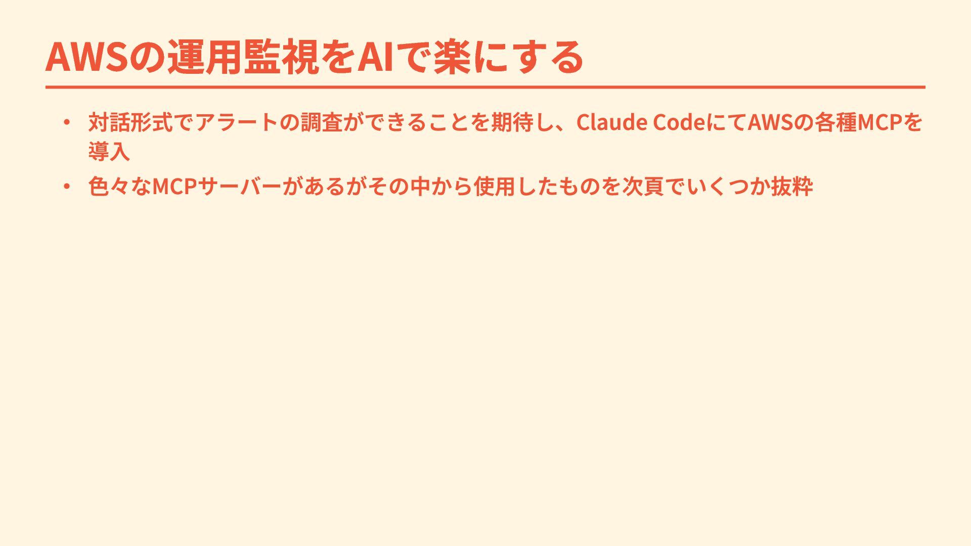 AWSの運用監視をAIで楽にする ・ 対話形式でアラートの調査ができることを期待し、Claude CodeにてAWSの各種MCPを 導入 ・ 色々なMCPサーバーがあるがその中から使用したものを次頁でいくつか抜粋