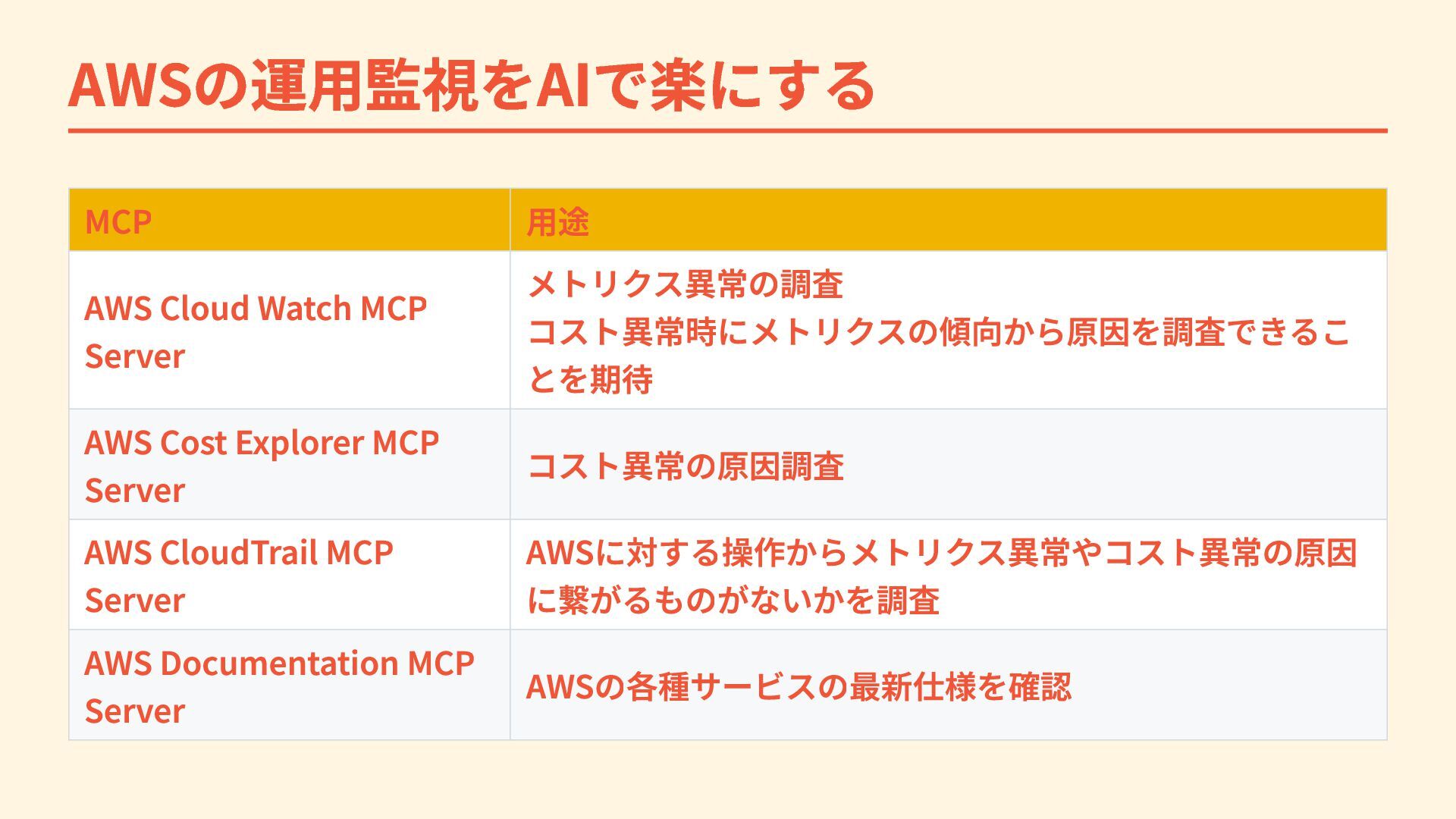 AWSの運用監視をAIで楽にする MCP 用途 AWS Cloud Watch MCP Server メトリクス異常の調査 コスト異常時にメトリクスの傾向から原因を調査できるこ