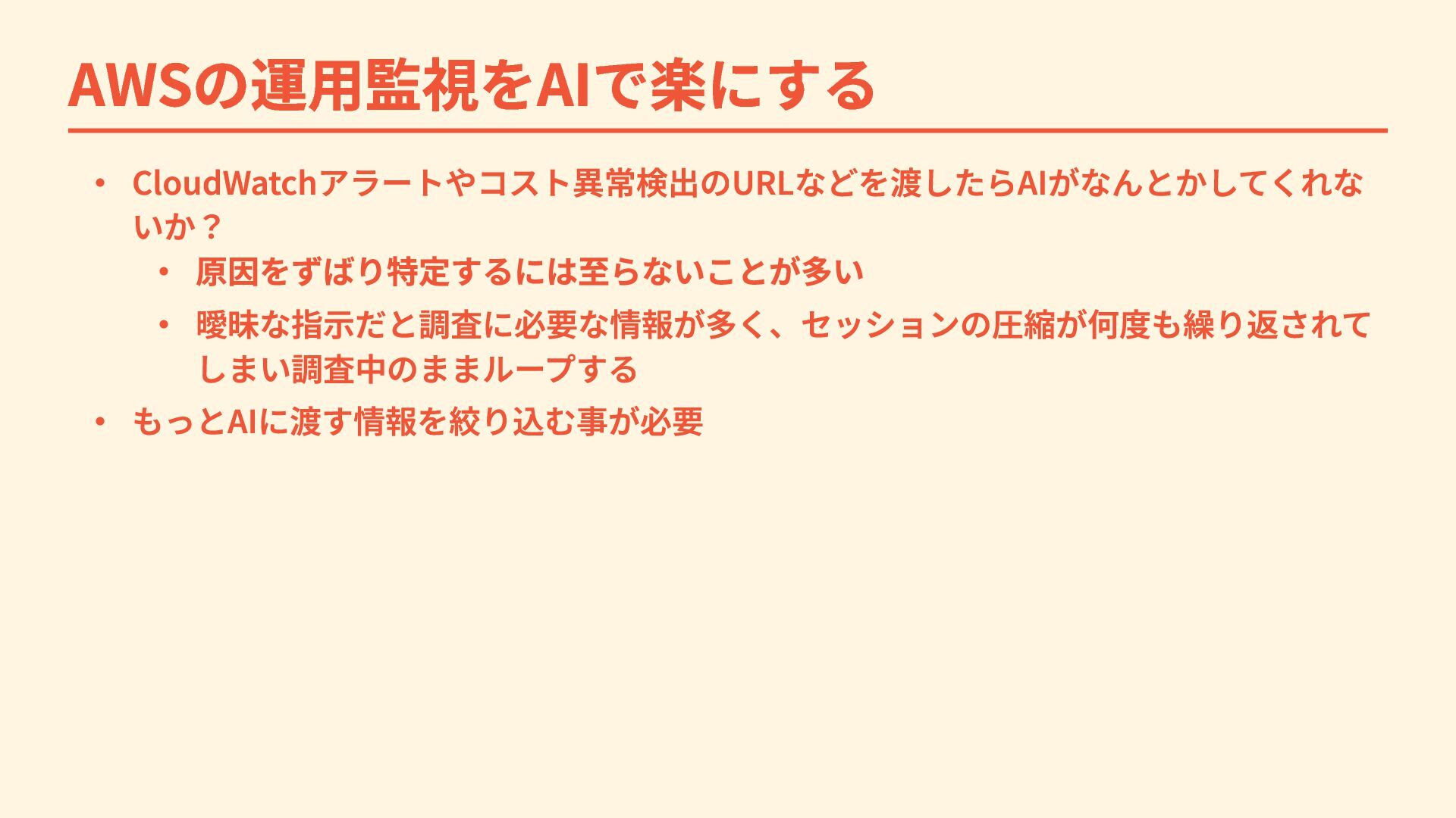 AWSの運用監視をAIで楽にする ・ CloudWatchアラートやコスト異常検出のURLなどを渡したらAIがなんとかしてくれな いか? ・ 原因をずばり特定するには至らないことが多い ・ 曖昧な指示だと調査に必要な情報が多く、セッションの圧縮が何度も繰り返されて しまい調査中のままループする ・