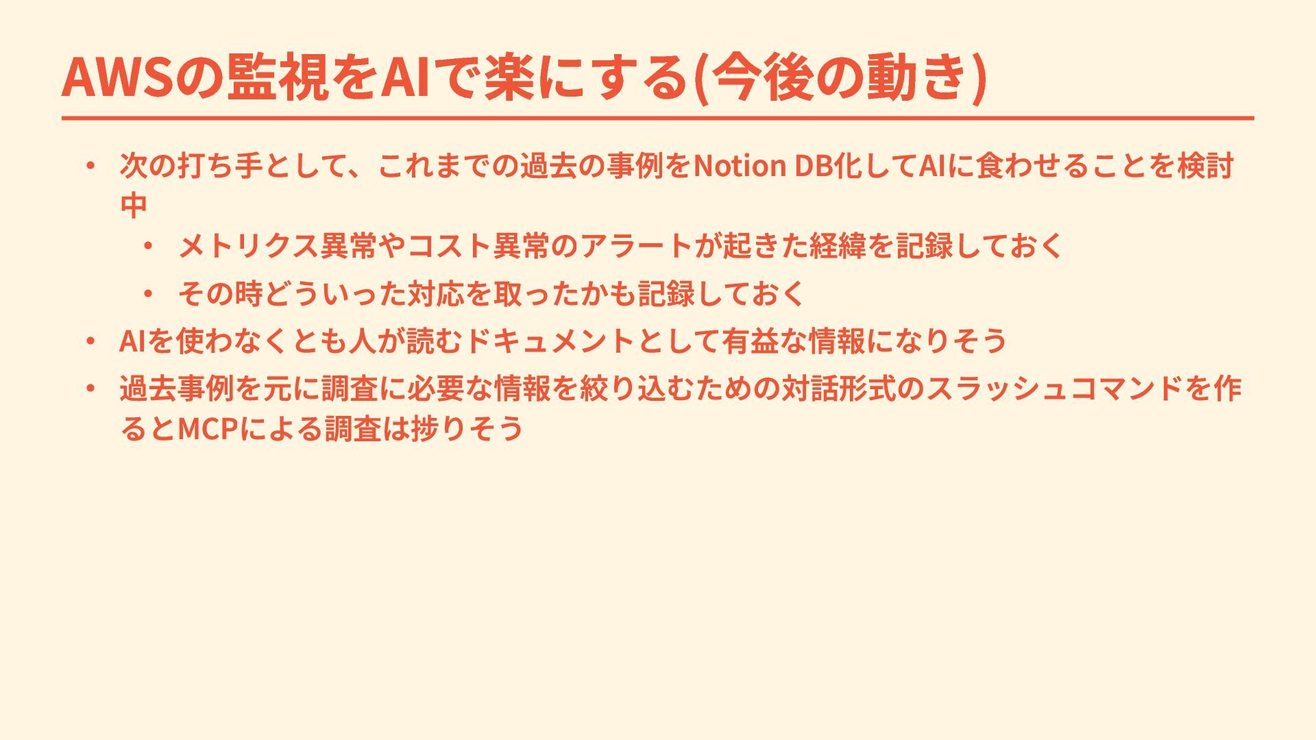 AWSの監視をAIで楽にする(今後の動き) ・ 次の打ち手として、これまでの過去の事例をNotion DB化してAIに食わせることを検討 中 ・ メトリクス異常やコスト異常のアラートが起きた経緯を記録しておく ・ その時どういった対応を取ったかも記録しておく ・
