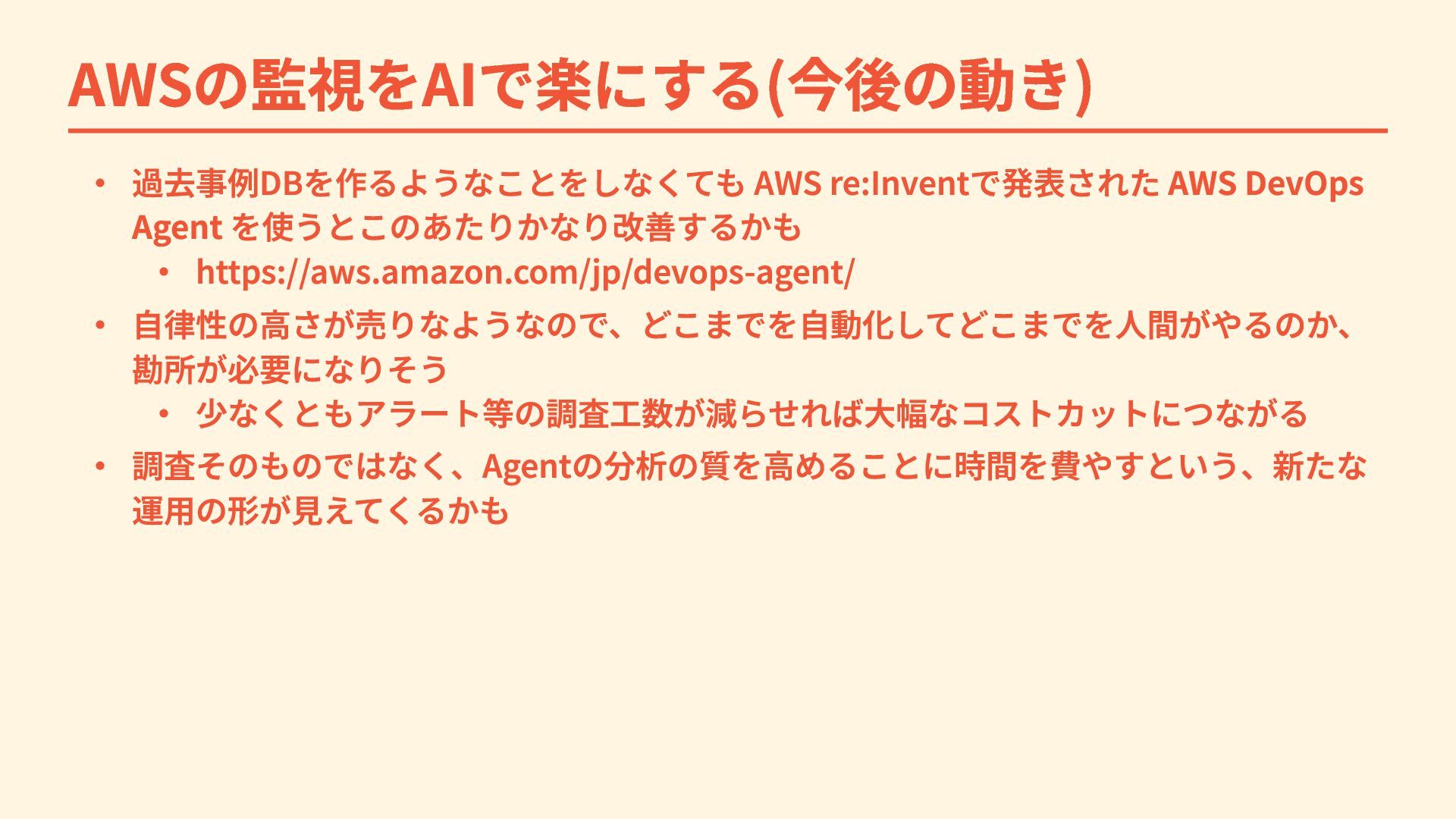 AWSの監視をAIで楽にする(今後の動き) ・ 過去事例DBを作るようなことをしなくても AWS re:Inventで発表された AWS DevOps Agent を使うとこのあたりかなり改善するかも ・