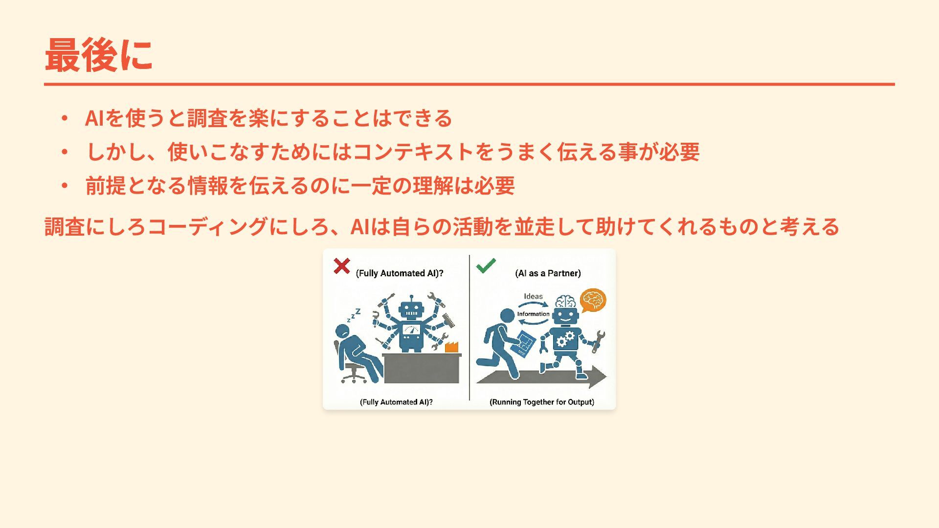 最後に ・ AIを使うと調査を楽にすることはできる ・ しかし、使いこなすためにはコンテキストをうまく伝える事が必要 ・ 前提となる情報を伝えるのに一定の理解は必要 調査にしろコーディングにしろ、AIは自らの活動を並走して助けてくれるものと考える