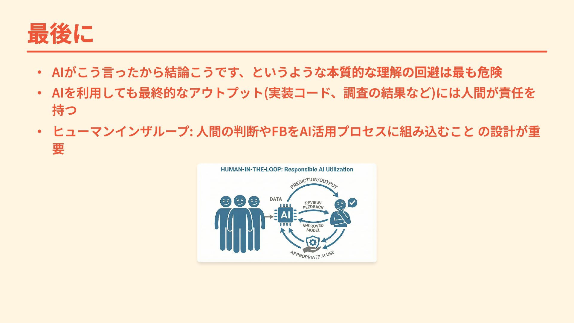 最後に ・ AIがこう言ったから結論こうです、というような本質的な理解の回避は最も危険 ・ AIを利用しても最終的なアウトプット(実装コード、調査の結果など)には人間が責任を 持つ ・ ヒューマンインザループ: 人間の判断やFBをAI活用プロセスに組み込むこと の設計が重