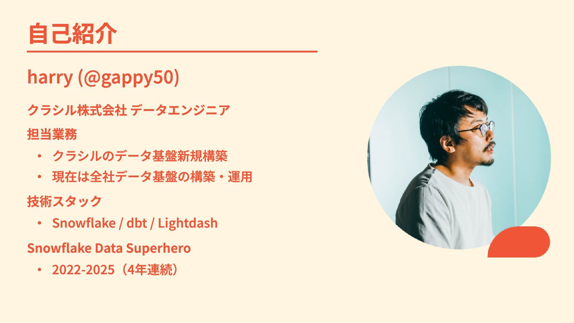 自己紹介 harry (@gappy50) クラシル株式会社 データエンジニア 担当業務 ・ クラシルのデータ基盤新規構築 ・ 現在は全社データ基盤の構築・運用