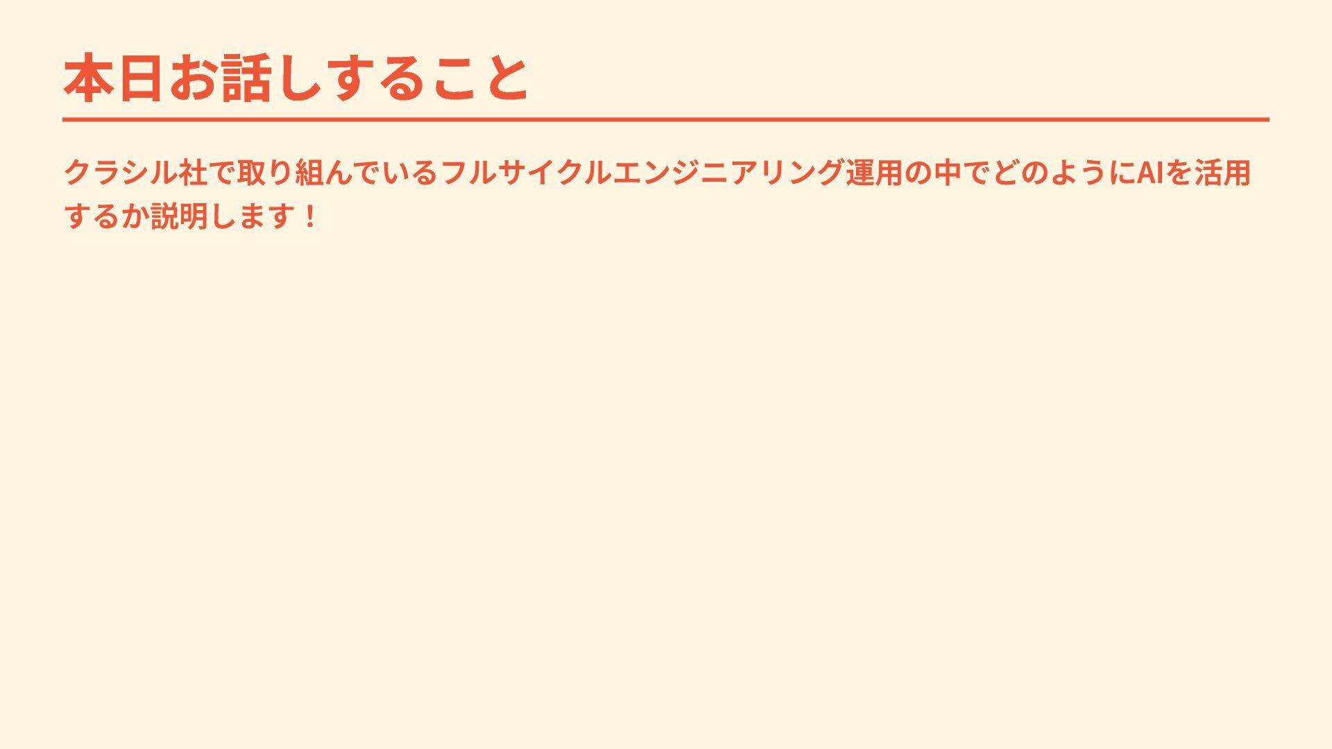 本日お話しすること クラシル社で取り組んでいるフルサイクルエンジニアリング運用の中でどのようにAIを活用 するか説明します!