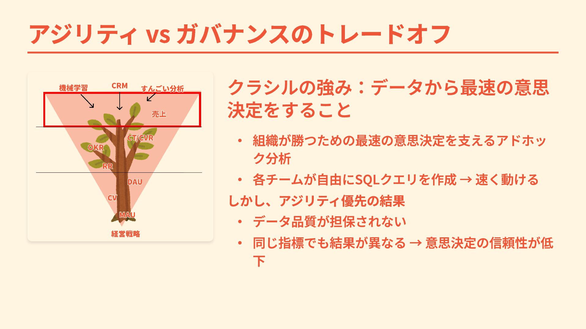 → 速く動ける しかし、アジリティ優先の結果 ・ データ品質が担保されない ・ 同じ指標でも結果が異なる → 意思決定の信頼性が低 下