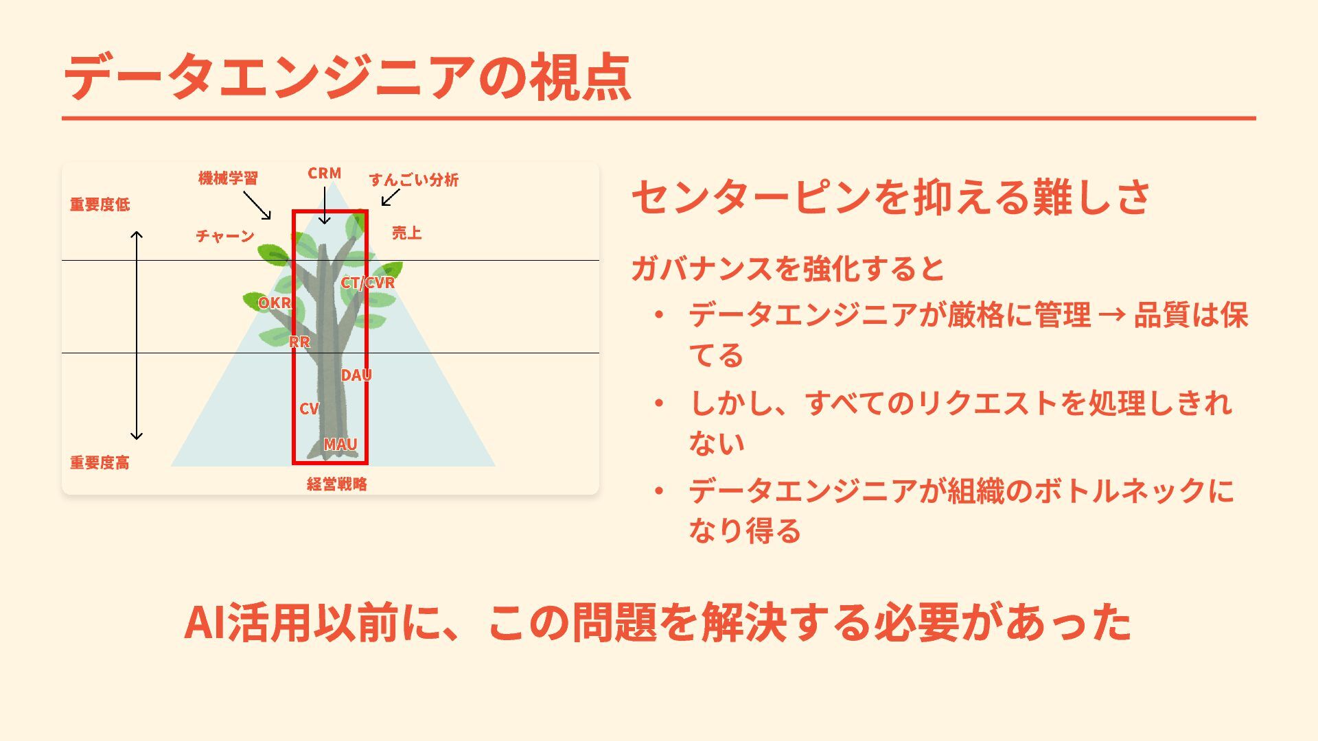 データエンジニアの視点 センターピンを抑える難しさ ガバナンスを強化すると ・ データエンジニアが厳格に管理 → 品質は保 てる ・ しかし、すべてのリクエストを処理しきれ