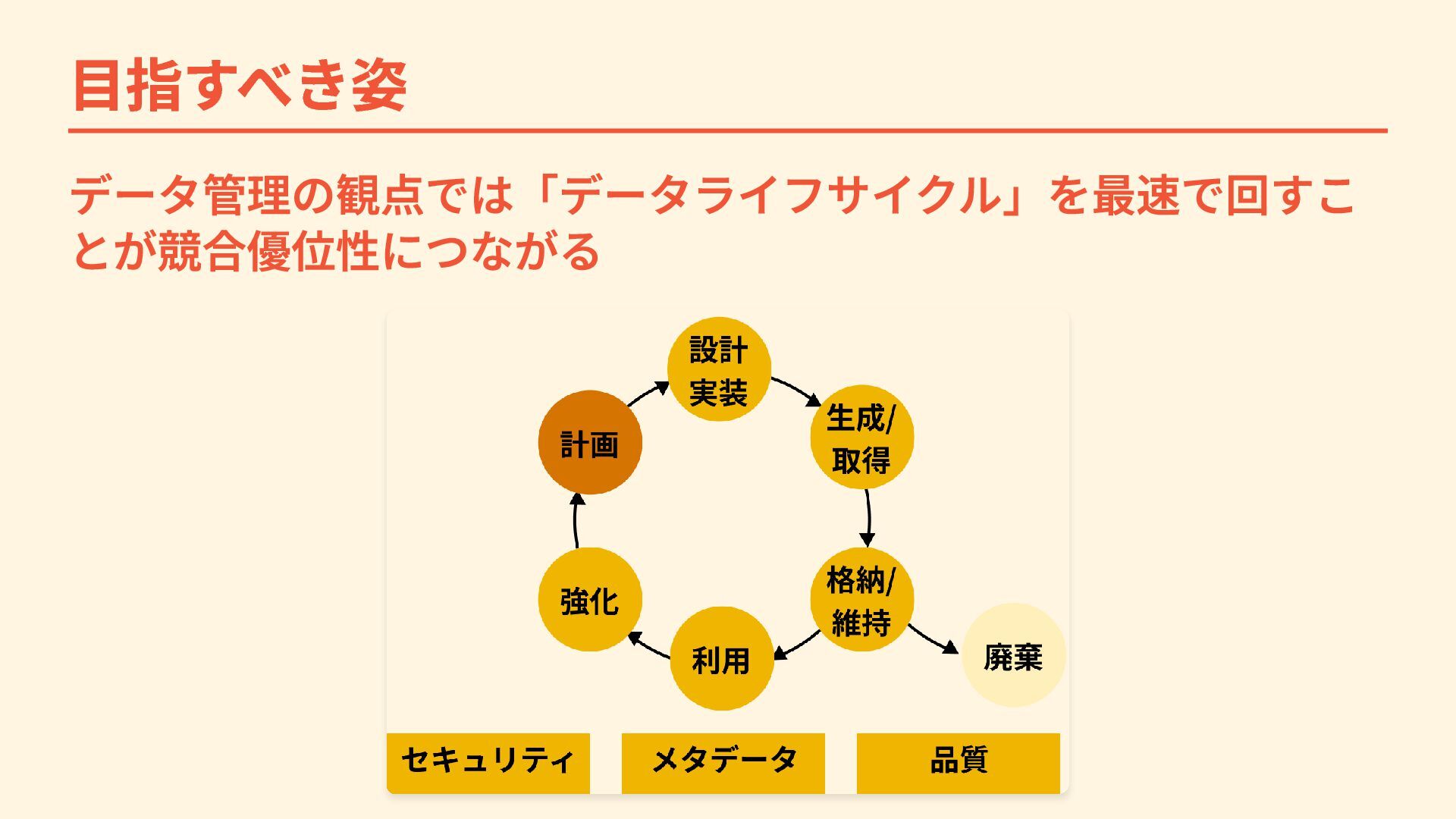 目指すべき姿 データ管理の観点では「データライフサイクル」を最速で回すこ とが競合優位性につながる