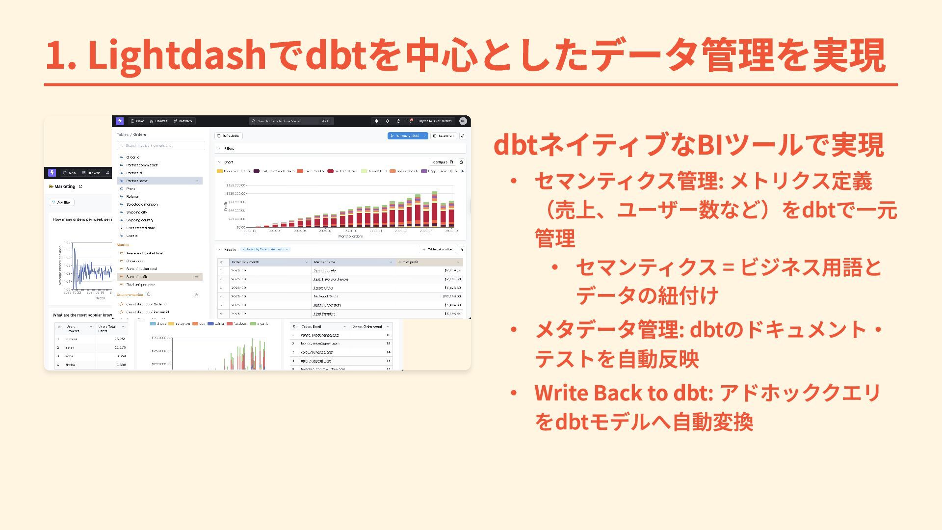 1. Lightdashでdbtを中心としたデータ管理を実現 dbtネイティブなBIツールで実現 ・ セマンティクス管理: メトリクス定義 (売上、ユーザー数など)をdbtで一元 管理 ・ セマンティクス